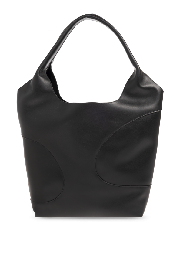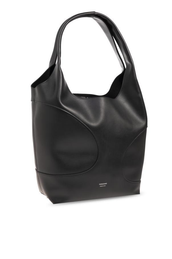 Black shopper bag from FERRAGAMO. Made of leather, this design is embellished with an embossed logo and stitching details and features two half-round handles, silver-tone metal hardware and one internal compartment with a strapped zip pouch.