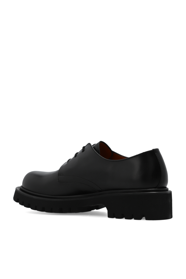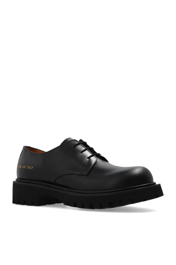 Black derby shoes from Common Projects. Made of smooth leather, this lace-up pair features a gold-tone series print and black rubber sole.