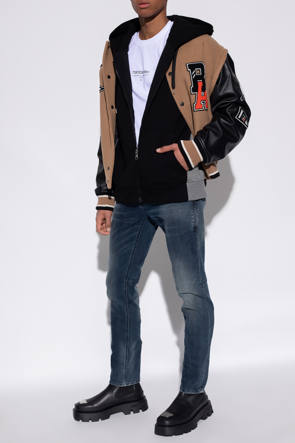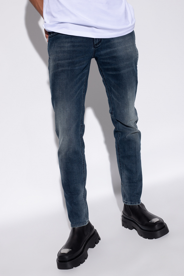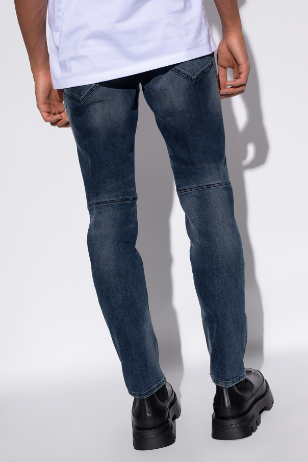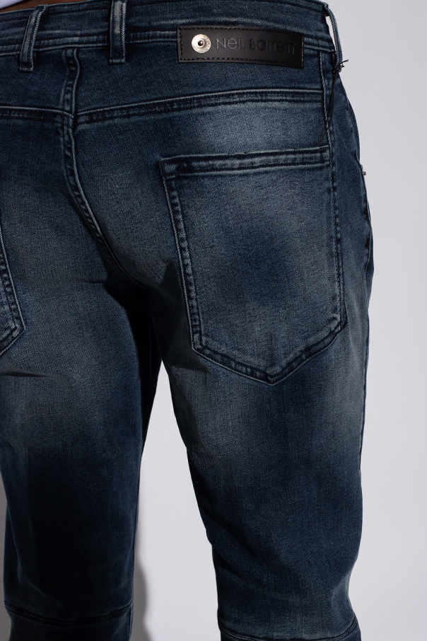 Navy blue jeans from Neil Barrett. Falling with tapered legs, this pair features a zip fly with a button, four slip pockets, a logo-embossed patch in black and silver-tone, distressed effects and raw hems.