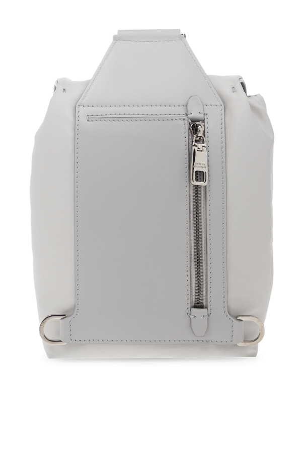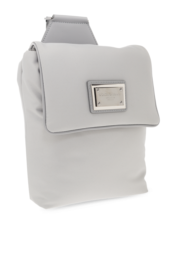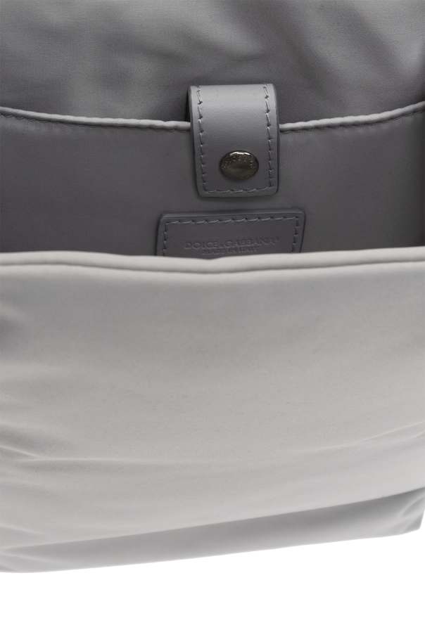 Grey belt bag from Dolce & Gabbana. Made of fabric with leather trims, this design features magnetic snaps, a logo-engraved square detail, zipped back pocket, adjustable strap in black and one internal compartment with one snap-fastened pocket.