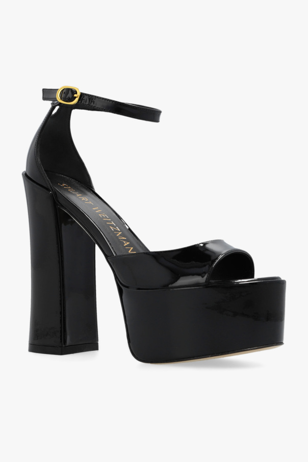 Black ‘Skyhigh’ platform sandals from Stuart Weitzman. Made of patent leather, this model sits on a cream sole in leather and rubber and features an adjustable buckle strap at the ankle.
