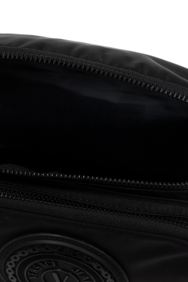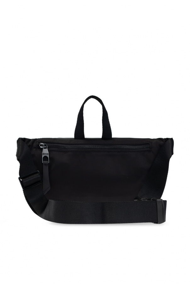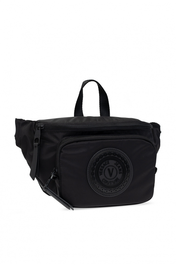Black belt bag from Versace Jeans Couture. Fastened with a zip, this design features a front zip pocket, a rubber logo appliqué, half-round handle, adjustable belt, one internal compartment and black metal hardware.