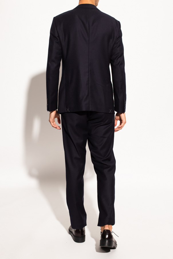 Navy suit from Giorgio Armani. Made of wool, this design is enriched by a stripe pattern. It includes a buttoned blazer with three slip pockets and notch lapels as well as straight leg trousers with a zip fly, button fastening and two side pockets.