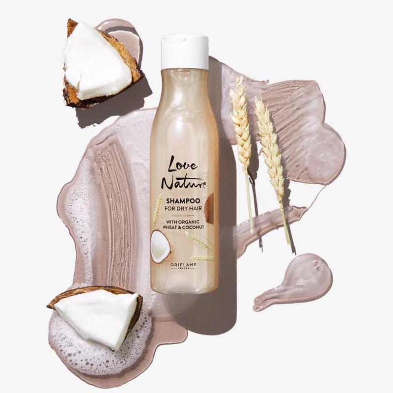 Питательный шампунь с натуральной органической пшенницей и маслом кокоса восстановит сухие волосы и придаст им живости и сил.