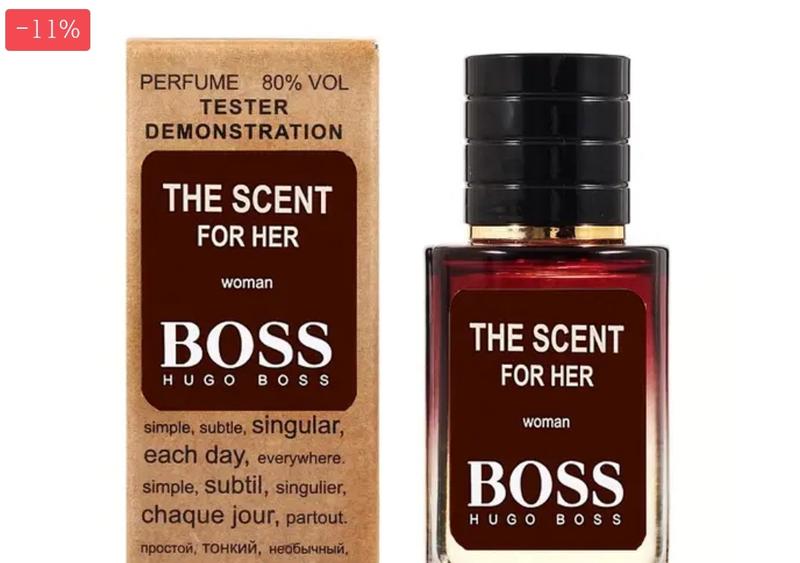 Boss The Scent For Her Hugo Boss – истинно женский аромат из группы фруктово-цветочных. Выпущенные в 2016 году, этот парфюм продолжил линейку Boss The Scent, став одним из семи ароматов для женщин в этой серии. Пирамида можно назвать лаконичной, без сложных переливов. Основные аккорды здесь цветочно-фруктовые и сливочно-кремовые с нюансами какао. При этом все ноты гармонично дополняют друг друга, создавая общее впечатление легкости и теплой женственности.