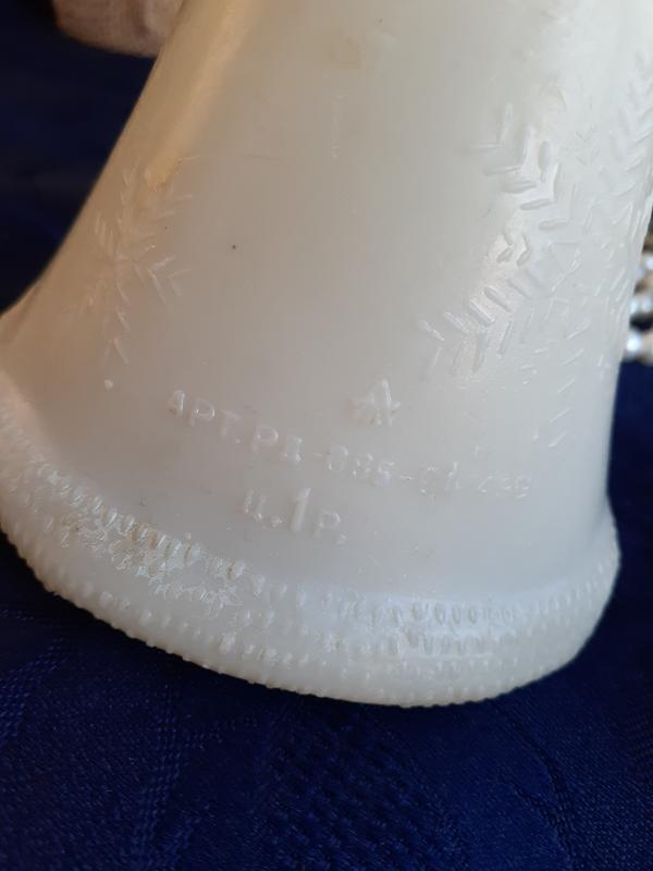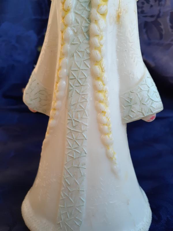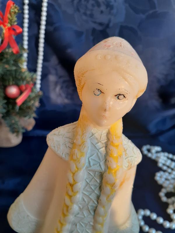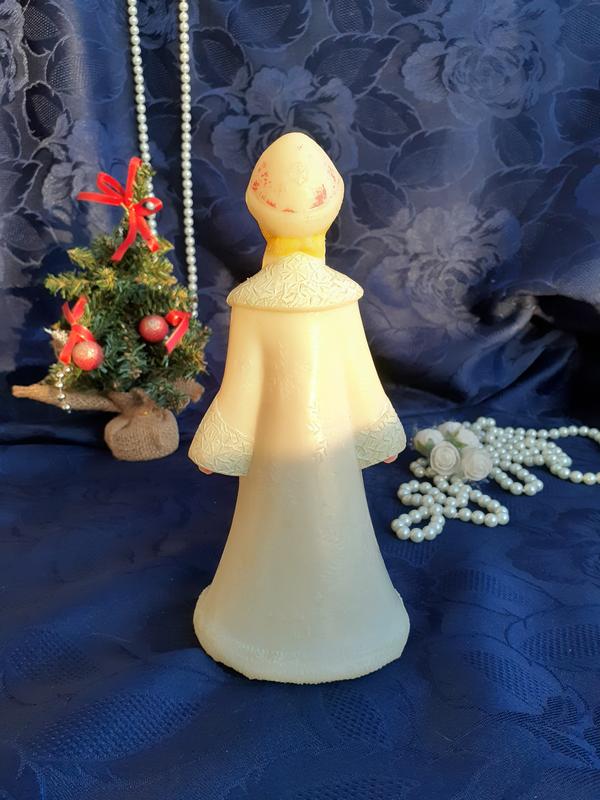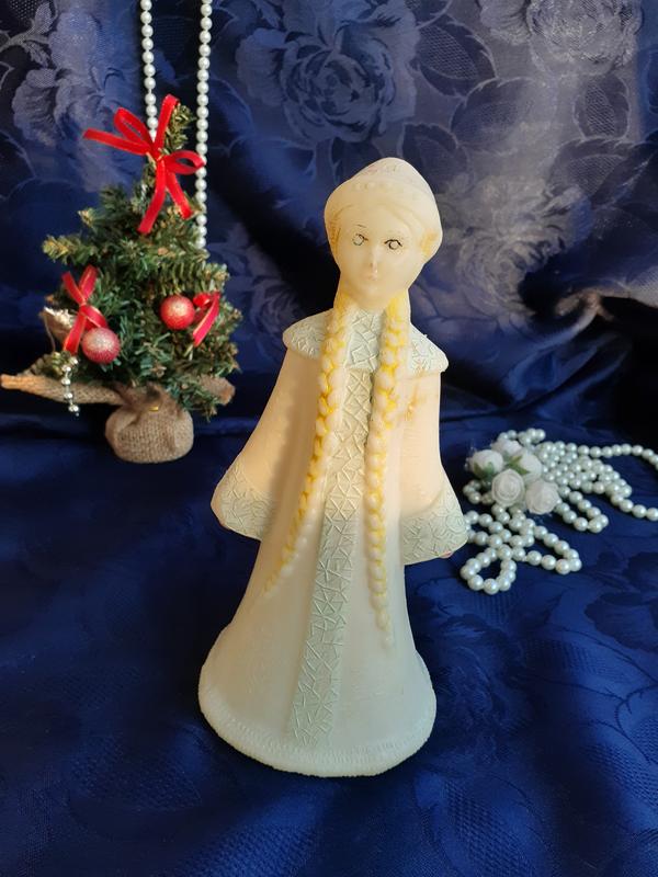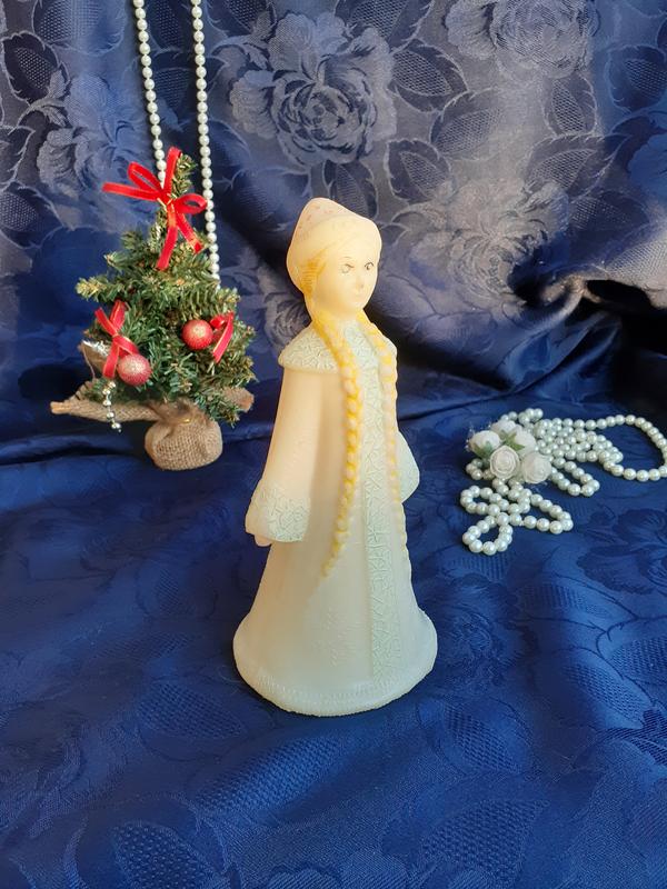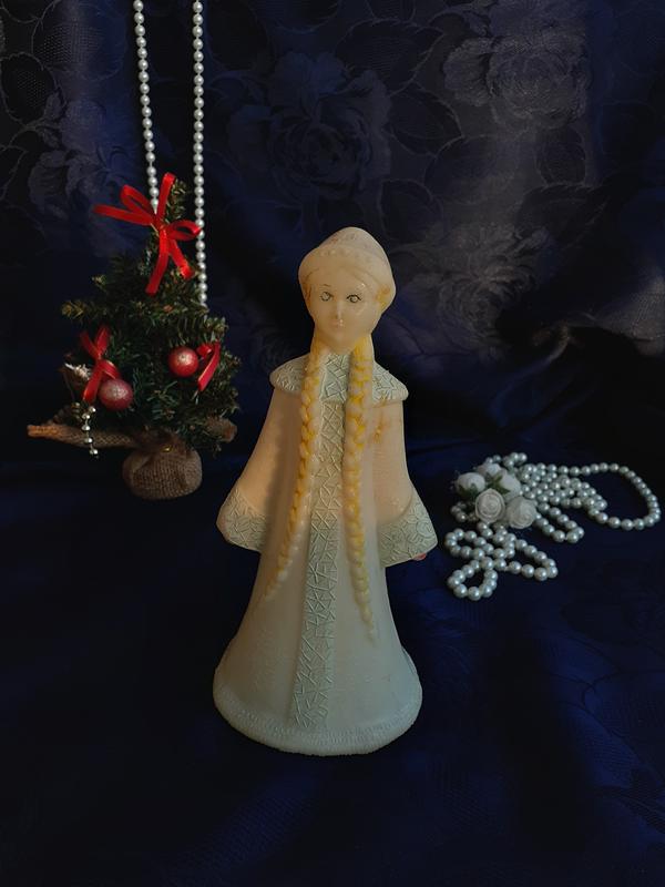 Снегурочка небольшая, высотою 20 см, диаметр донной части - 9 см. Маркирована, на тыльной стороне оттиск клейма завода и цены.