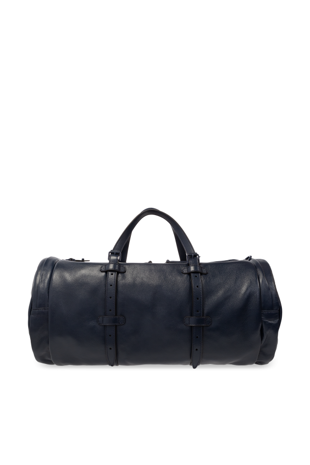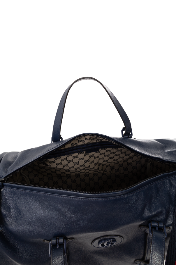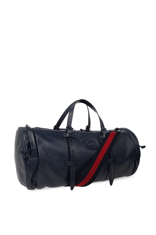 Navy blue duffel bag from Gucci. Crafted from buffalo leather, this design secures with a two-way zipper and showcases ‘Double G’ logo hardware on the front, zip pockets on the sides, two adjustable handles, one detachable and adjustable shoulder strap in navy blue and red and one internal compartment with two zip pockets.