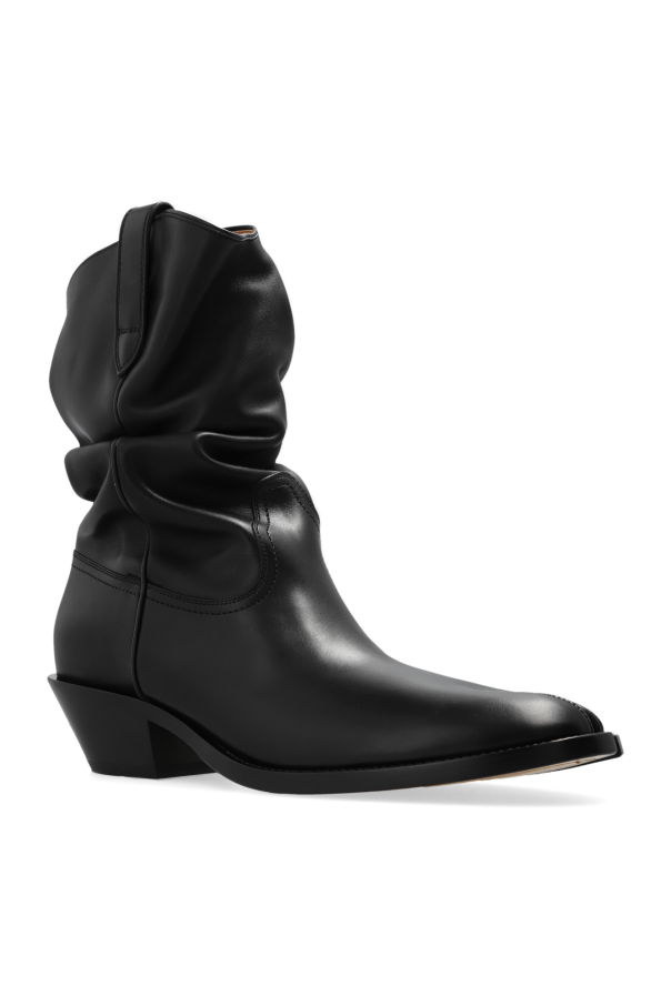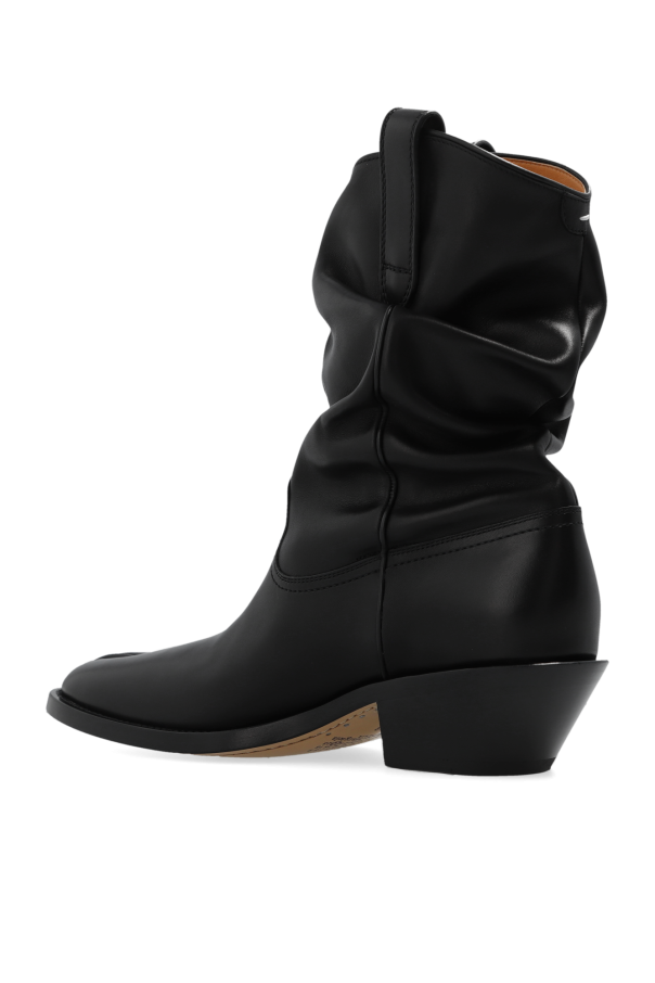 Black cowboy boots from Maison Margiela. Made of leather with the brand's signature ‘Tabi’ split-toe design, this model sits on a beige and black rubber sole and features a slip-on silhouette and a draped upper accentuated with iconic white four stitches.