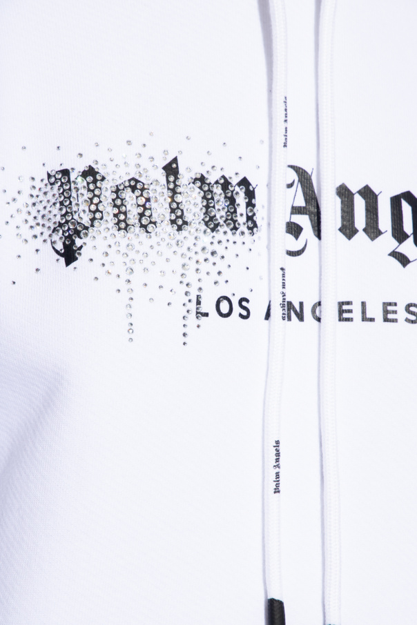 White cropped hoodie from Palm Angels. Crafted from cotton, this garment features a drawstring hood, black logo print, crystals and ribbed edges.