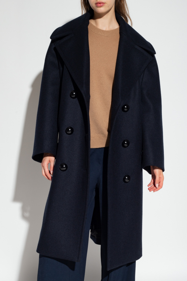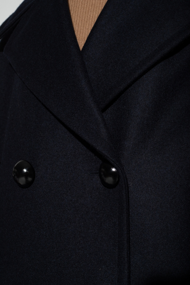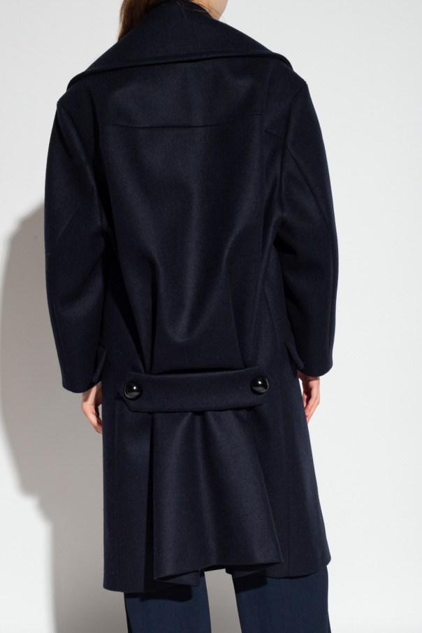 Navy blue coat from Alaia. Crafted from wool with a relaxed, double-breasted silhouette, this style features button fastenings, notch lapels, two slip pockets, two flapped pockets, long sleeves and a cinching belt with buttons at the back.