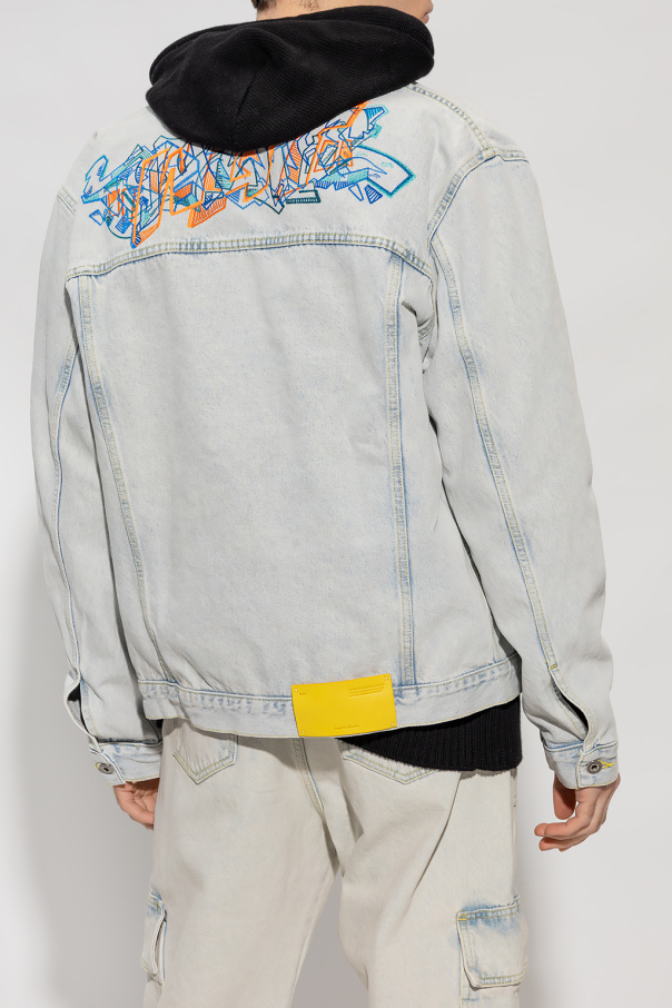 Light blue denim jacket from Off-White. Emblazoned with graffiti-inspired logo embroidery in orange, green and blue, this style fastens with buttons and features a yellow patch with an embossed logo, two flapped pockets with snaps, two slip pockets and long sleeves with button cuffs.