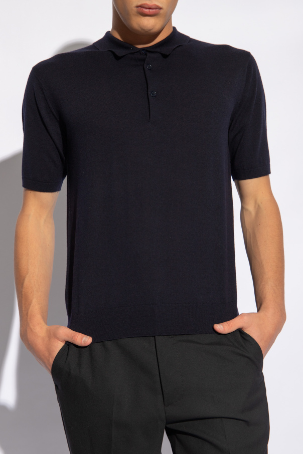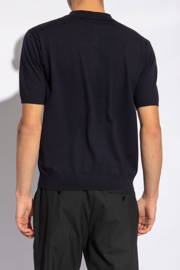 Navy polo shirt from Dries Van Noten. Made of merino wool, this short sleeve design features buttons at the collar and ribbed trims at the hem and cuffs.