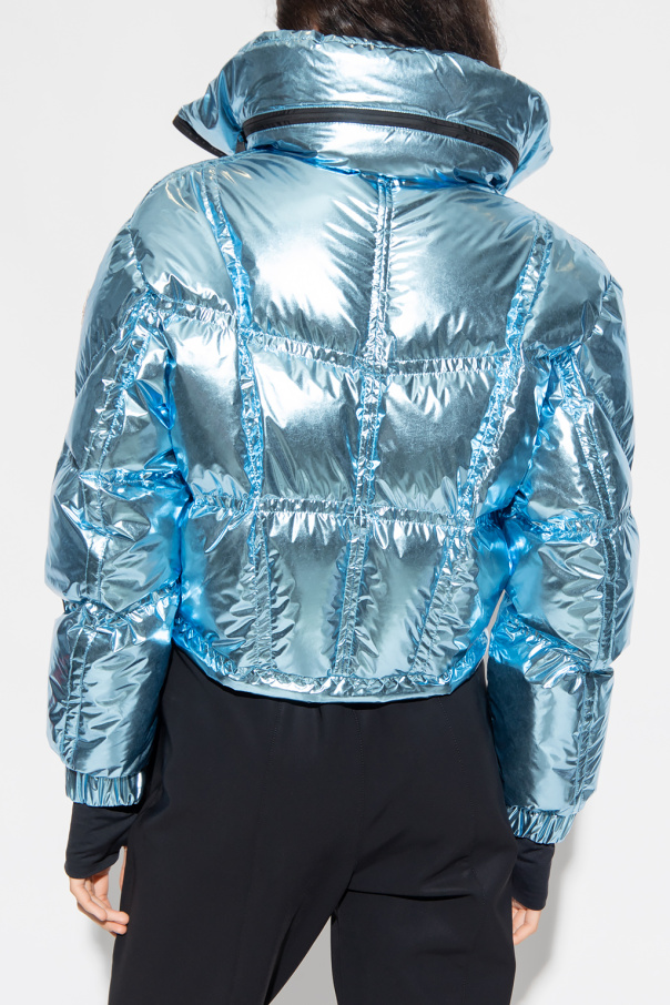 Blue ‘Valsorey’ quilted down jacket from Moncler Grenoble, the ‘Moncler Grenoble Performance & Style’ collection. Made of fabric with a metallic finish, this garment features a zip fastening, stand collar with a concealed hood, sleeve patch with a logo, two zip pockets, drawstring hem and long sleeves with ribbed cuffs and thumb holes.