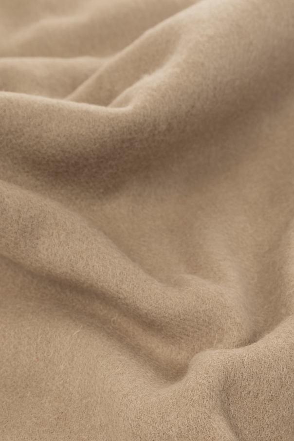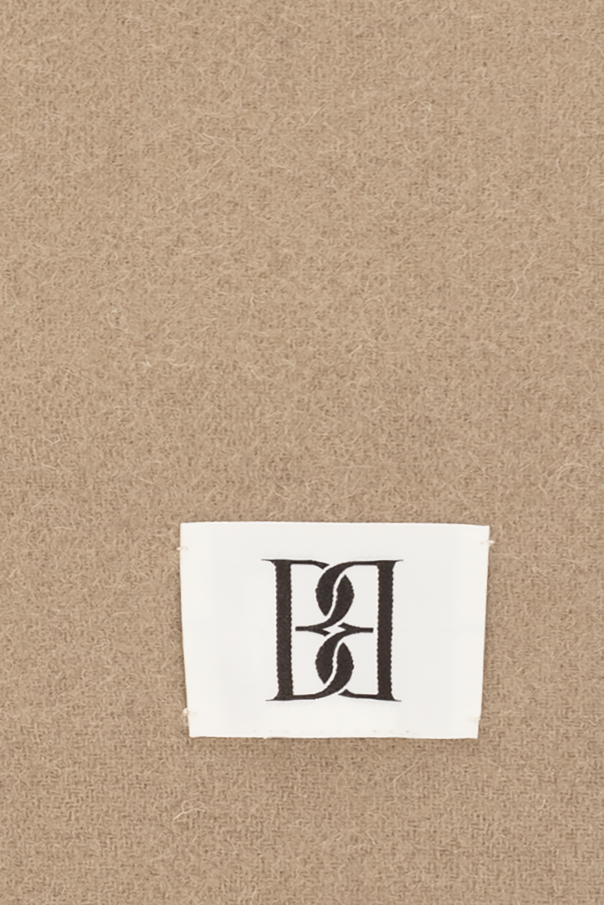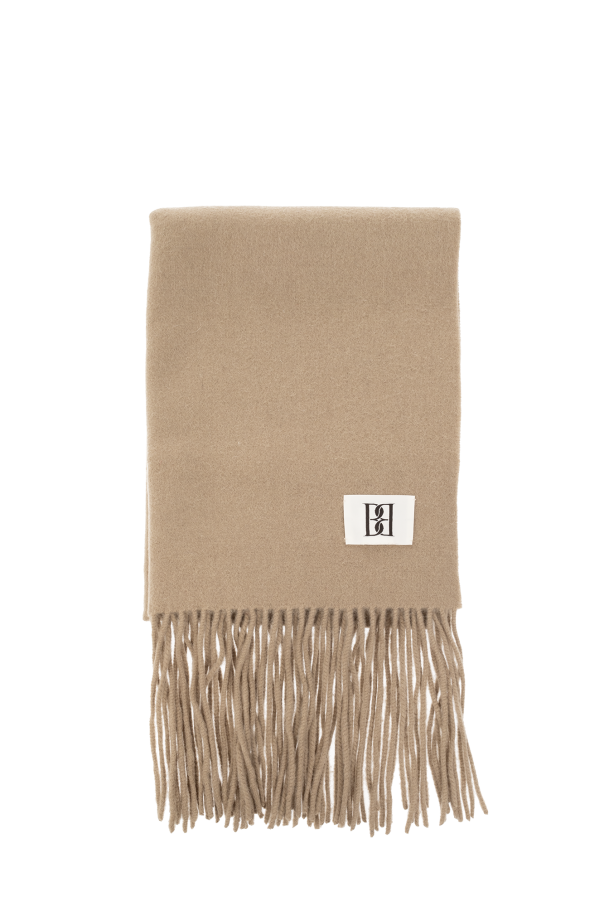 Beige scarf from By Malene Birger. Made from wool, this item showcases an embroidered logo pattern and fringed edges.