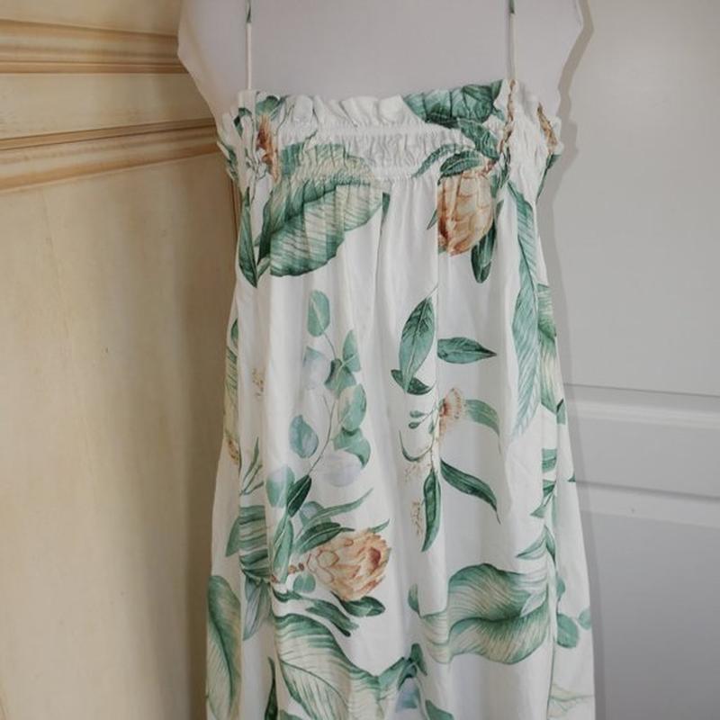 Платье оформлено цветочным принтом с рисунками растений и цветов оттенков зеленого и бежевого на светлом фоне. Верхняя часть платья имеет декоративные элементы, напоминающие цветы, придающие романтичность образу. Благодаря юбке свободного кроя, платье выглядит легко и воздушно, что делает его подходящим для теплой погоды или для летних мероприятий.