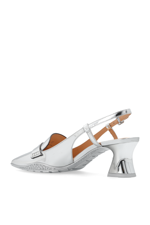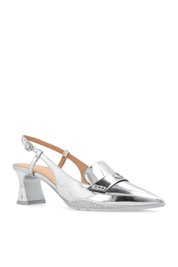 Silver-tone ‘Nikola’ pumps from Coach. Crafted from patent leather, this pair features a buckled ankle strap, tactile logo, pointed toe and silver-tone rubber sole.