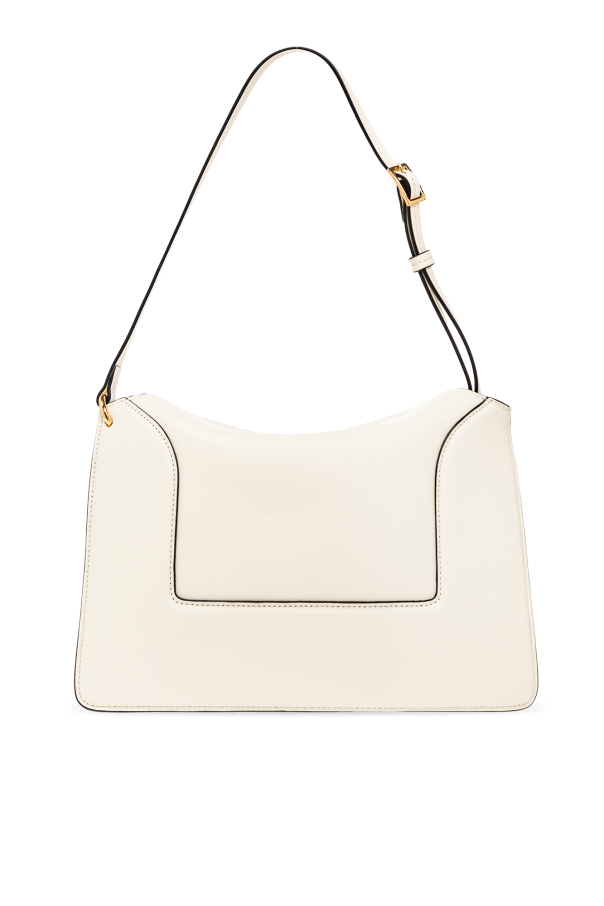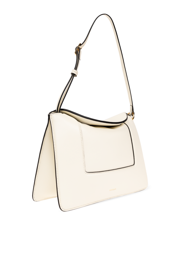 White ‘Penelope’ shoulder bag from Wandler. Made from smooth calf leather, this design secures with magnetic closures and showcases a printed gold-tone logo on the front, black edges, gold-tone metal hardware, two separate internal compartments and a long, adjustable shoulder strap.