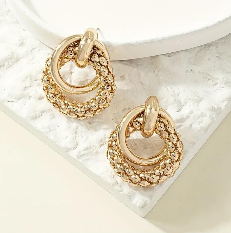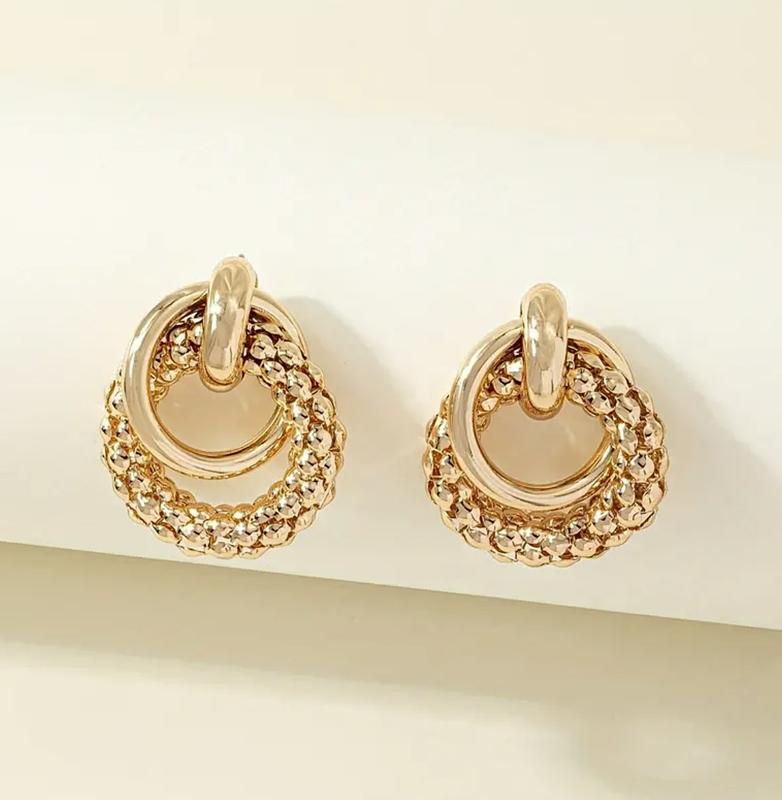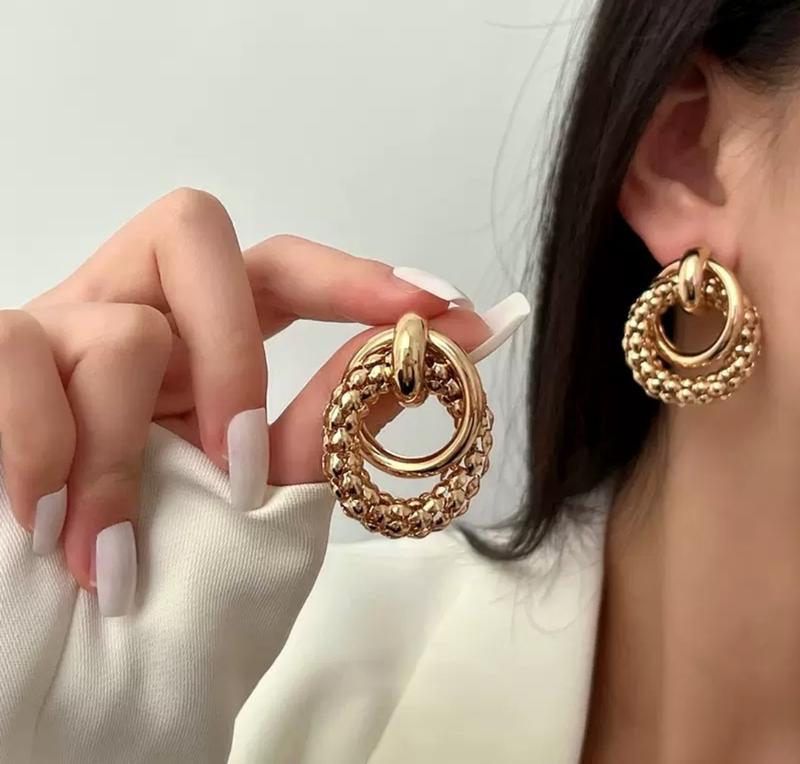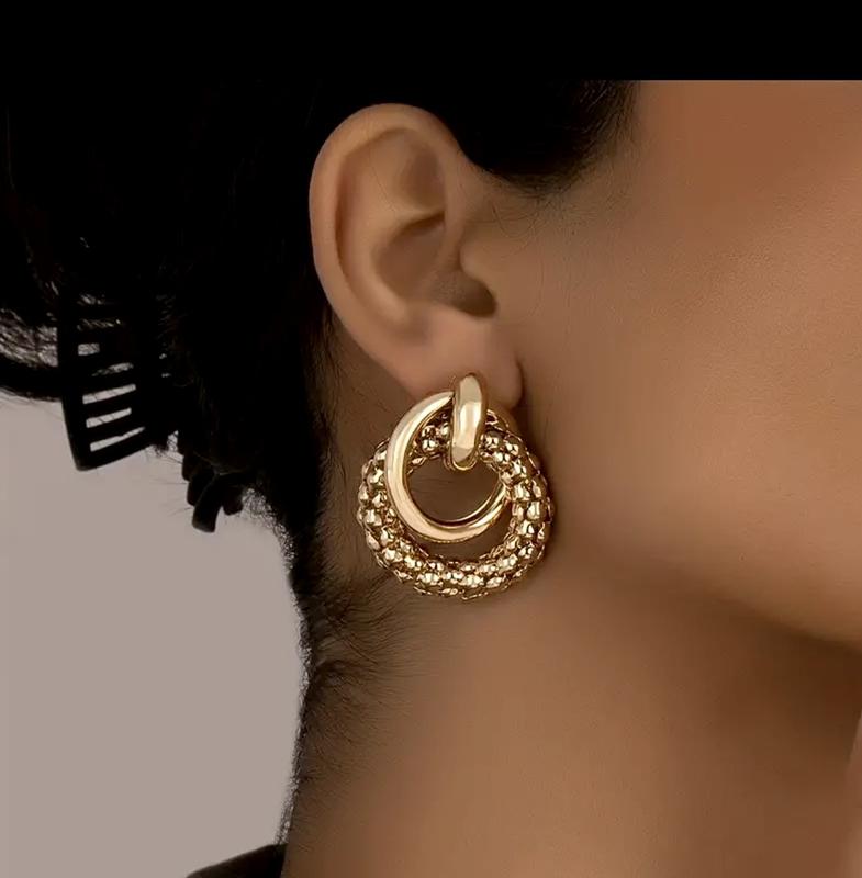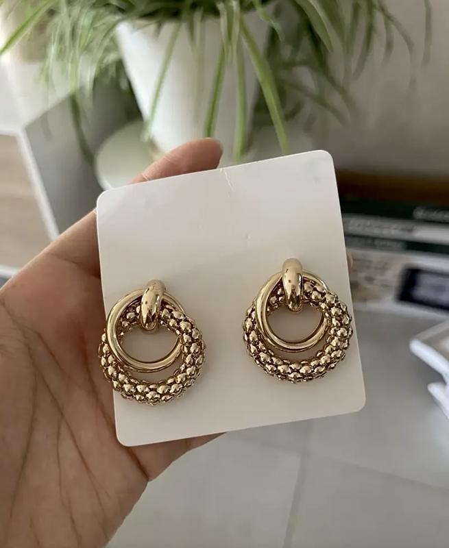 Эти золотые серьги — сочетание классики и современного дизайна. Они выполнены в виде объемных колец, одно из которых гладкое и блестящее, а другое — с изысканной текстурой, создающей эффект роскоши и элегантности.