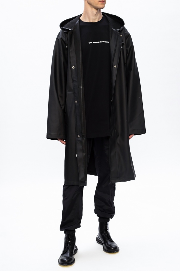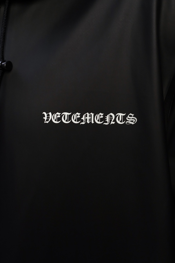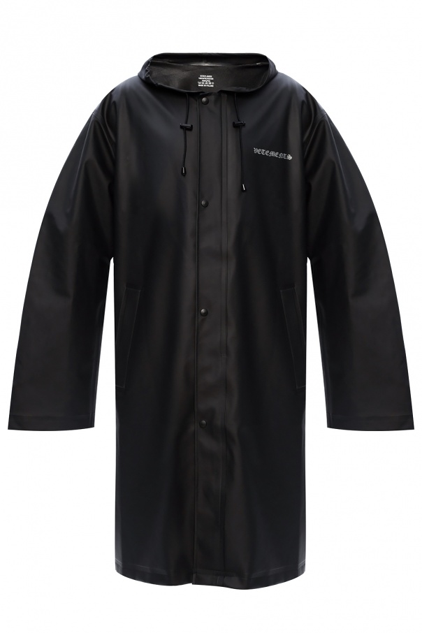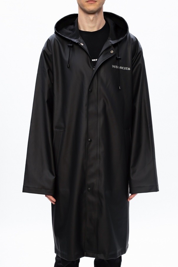 Black raincoat from Vetements. Crafted from the technical fabric, this functional and protective item has zip and snap fastenings, two pockets, long sleeves, drawstring hood and grey label's logo printed on both front and back.