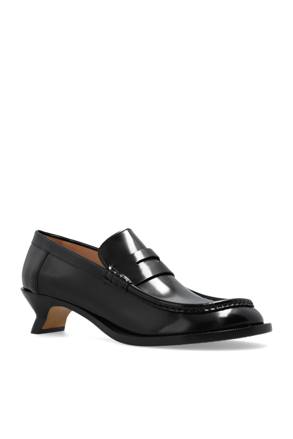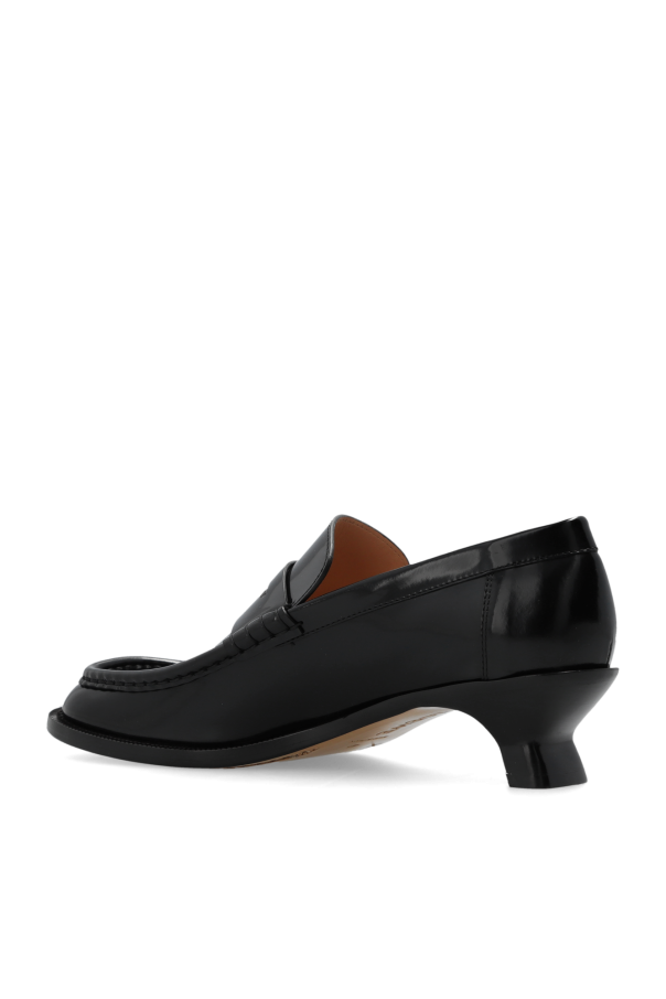 Black ‘Campo’ loafer pumps from Loewe. Made of leather with a slip-on silhouette, this model sits on a beige leather sole and features a round, asymmetrical toe and a decorative strap on the front.