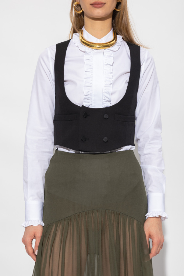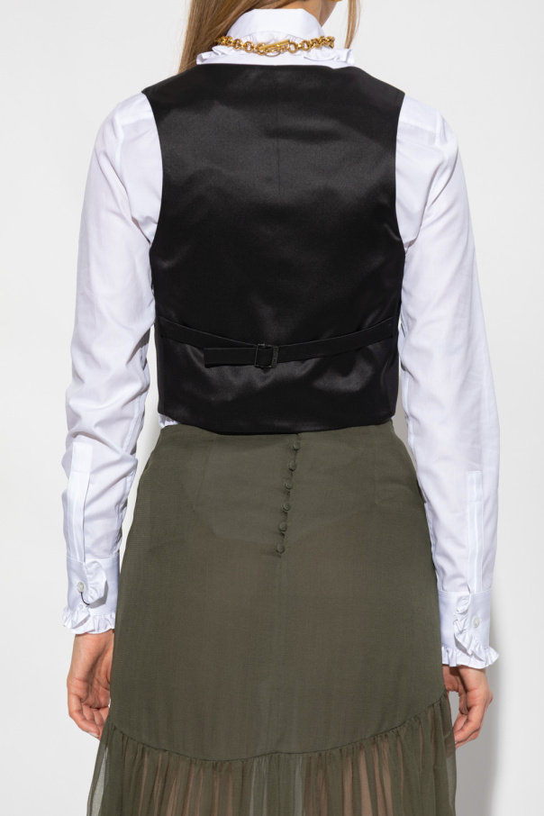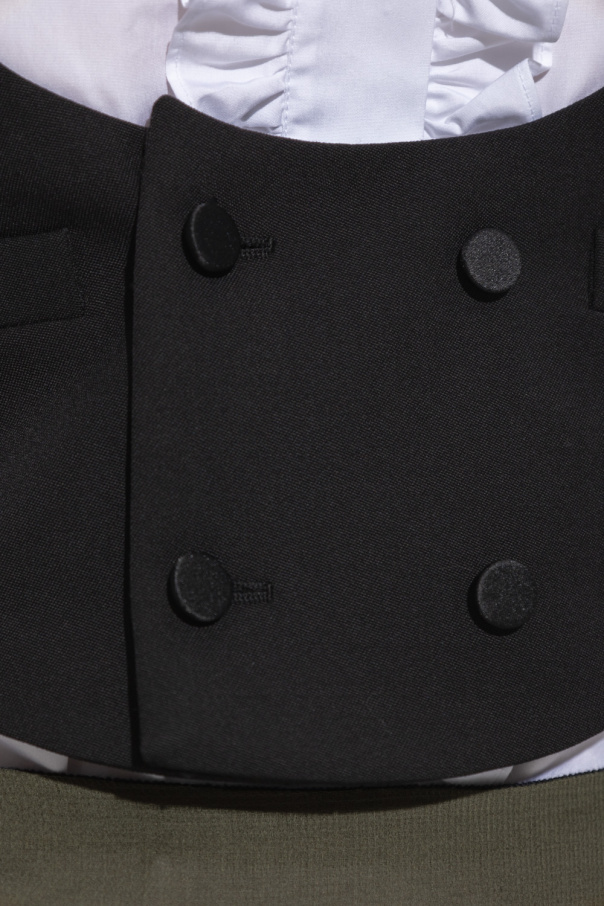 Black double-breasted vest from Saint Laurent. Made of wool, this garment features button fastenings, satin strap at the back, two slip pockets and plunging V-neck.