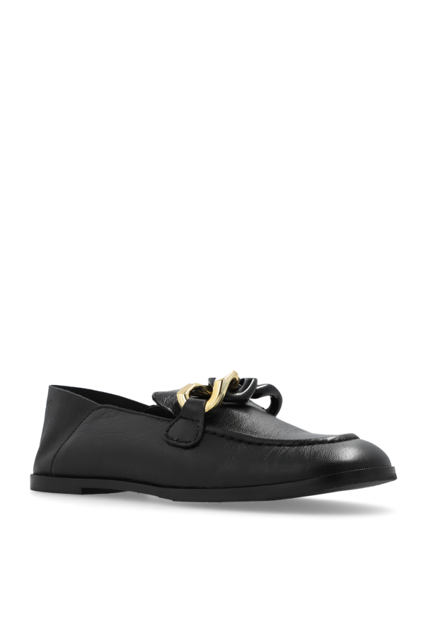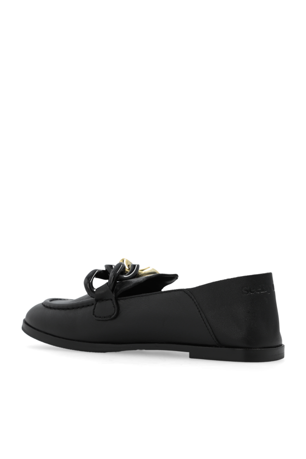 Black ‘Monyca’ loafers from See By Chloe. Made of goat leather, this pair features a chain with a decorative gold-tone chain link and a black rubber sole.