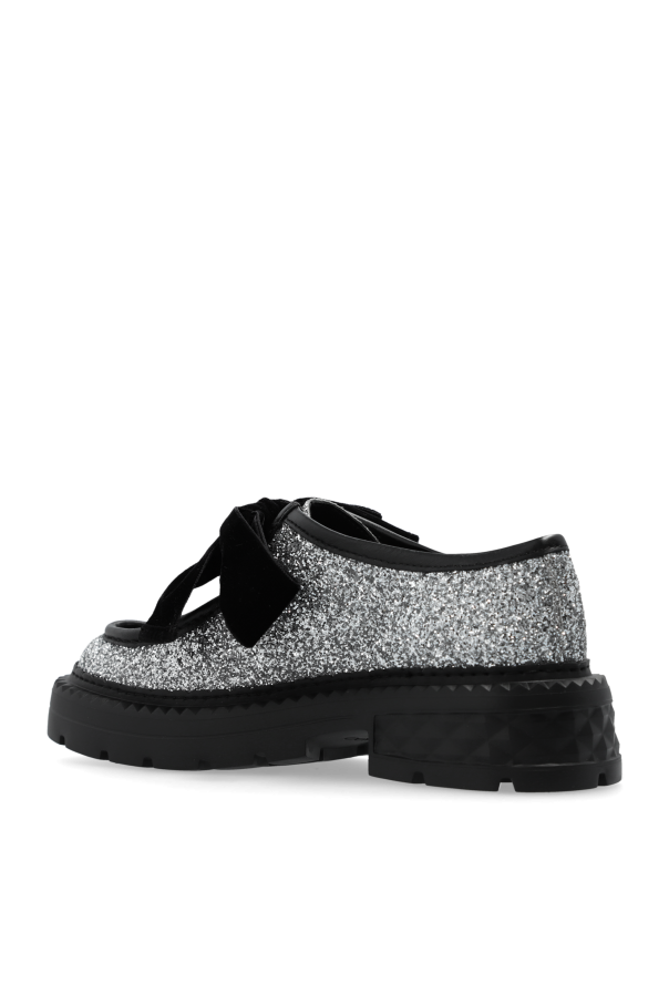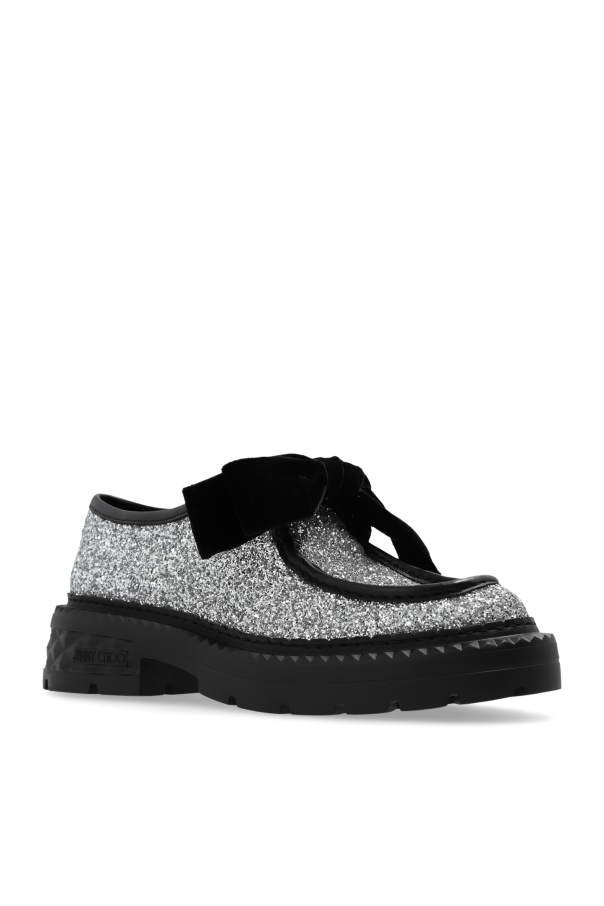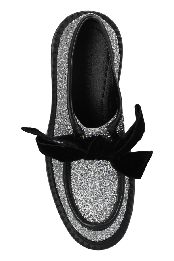 Introducing the "Marlow" loafers from the prestigious collection of Jimmy Choo, these shoes are a sophisticated blend of casual elegance and distinctive flair. Crafted with precision, the "Marlow" loafers are an homage to the relaxed boyfriend style, offering a looser, more casual silhouette that does not compromise on elegance or design. The dominant black color of the loafers is brilliantly contrasted with a sparkling silver glitter finish, giving them an eye-catching, shimmering appearance. The robust, flat rubber sole features a pronounced tread, suggesting enhanced durability and stability for the wearer. A large, black bow adorns the top, injecting an element of feminine elegance and contrasting beautifully with the shoe's otherwise sturdy and solid look. The interior, lined in 100% smooth black leather, promises utmost comfort, while the precision of the visible stitching on the upper speaks to the high-quality craftsmanship synonymous with Jimmy Choo. The designer's logo, elegantly placed on the insole, serves as a mark of authenticity and luxury. Why Purchase This Product? Exclusive Design: A unique blend of boyfriend-inspired casualness with feminine, elegant touches. Luxurious Materials: High-quality leather and a glitter finish that provides a dazzling appearance. Comfort & Stability: Smooth leather interior and a durable rubber sole for everyday wear. Attention to Detail: Precision stitching and a designer logo that signify premium craftsmanship.