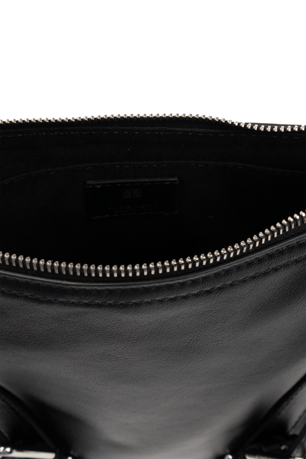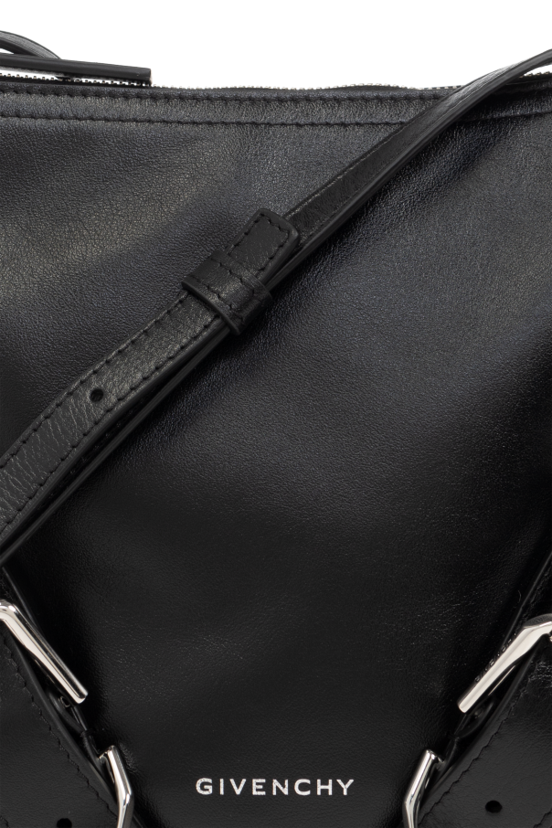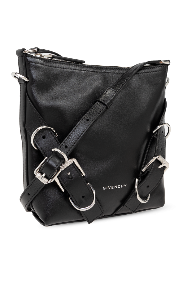 Introducing the ‘Voyou Small’ Shoulder Bag by the esteemed Givenchy, a paragon of elegance and functionality. Crafted with exquisite calfskin leather, this bag showcases a granular texture that exudes luxury. Its rectangular silhouette with softly rounded top corners blends modernity with softness, creating an accessory that complements any ensemble. Distinctive for its design, the bag features two straps with silver buckles on the front panel, crossing each other to form a decorative and adjustable element. The presence of the designer's silver logo subtly placed on the lower front panel enhances its exclusivity. The ‘Voyou Small’ is equipped with a long, adjustable strap made from a leather-like material, allowing for versatile wear over the shoulder or across the body. The interior reveals a spacious and functional compartment, complete with an additional pocket for smaller essentials. The visibility of the brand's label inside the bag not only confirms its authenticity but also aligns with the hallmarks of exclusive products. This bag, closing with a zipper, features an inner chamber and a slip pocket, maximizing organization and security. Why Purchase This Product? High-Quality Materials: Calfskin leather exterior with an acrylic and cotton interior, complemented by metal accents. Elegant Design: A classic black color and unique strap design with silver buckles make it a timeless piece. Versatility: Adjustable and comfortable strap offers diverse wearing options. Functionality: Ample space with an additional internal pocket for organization. Exclusivity: Bearing the Givenchy name, it stands as a testament to luxury and sophistication.