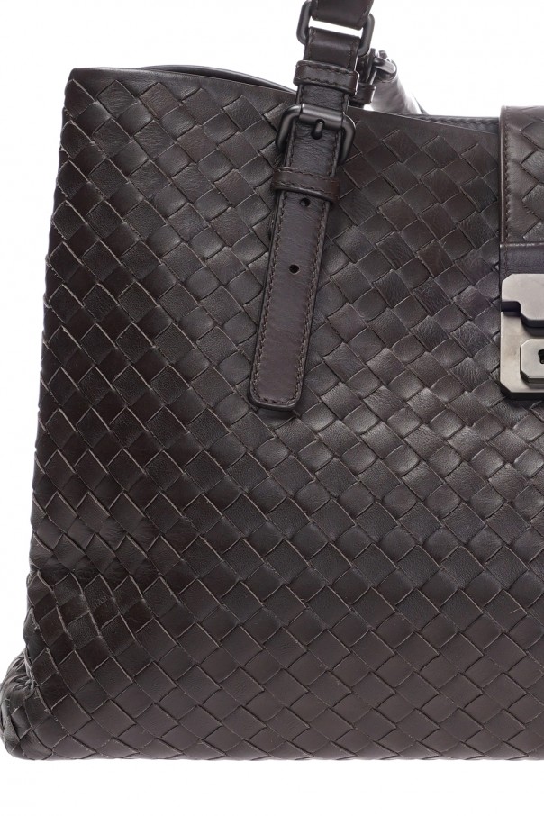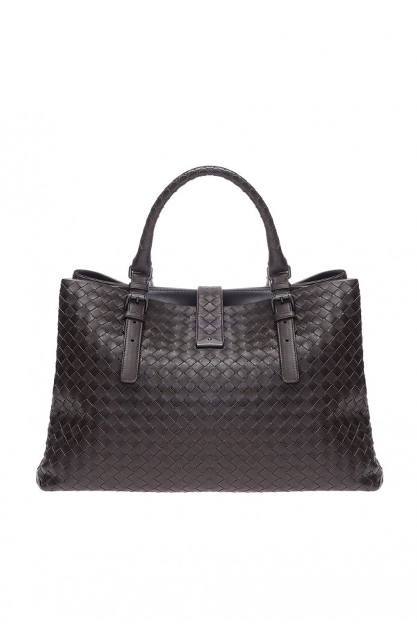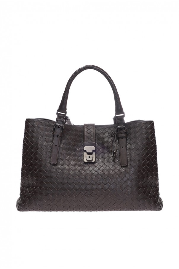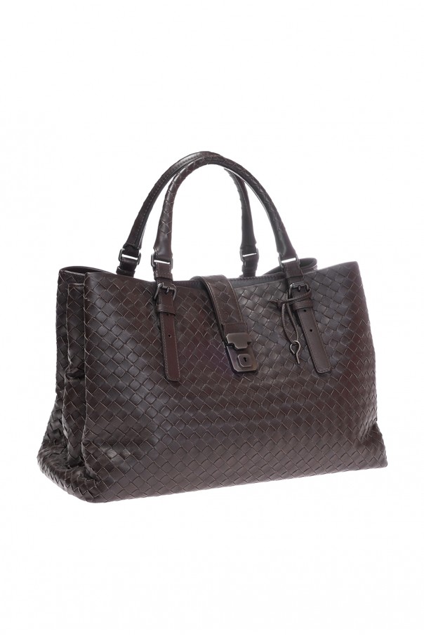 Large 'Roma' Bottega Veneta bag, in brown colour. Made of calf leather, covered with suede from within. Three compartments with a front clasp closure with a key and additionally the middle compartment has a snap button closure. Holds A4. Inside zippered side pocket and smartphone sleeve. Two adjustable handles.
