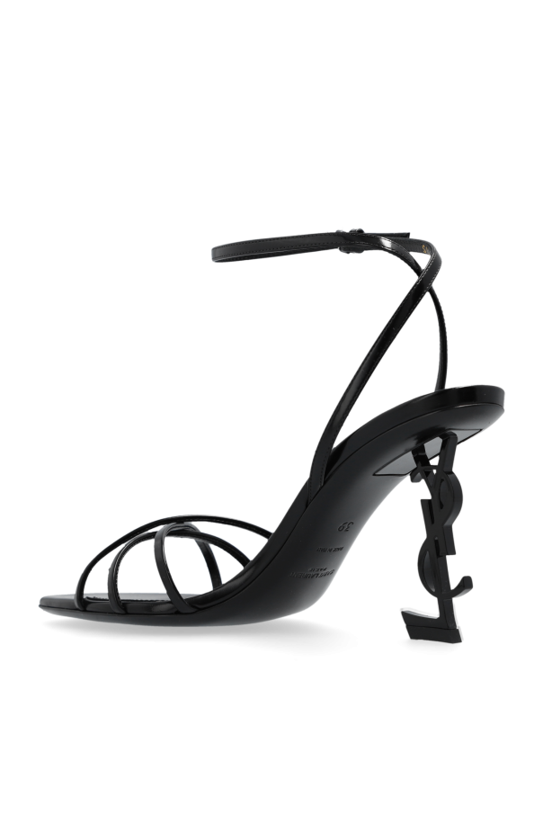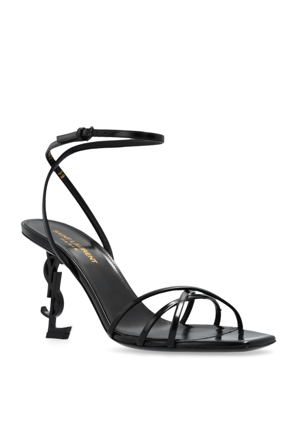 Black ‘Opyum’ heeled sandals from Saint Laurent. Made from smooth leather with a square toe, this model sits on a black leather sole and showcases an adjustable ankle strap with a buckle and a logo-shaped heel.