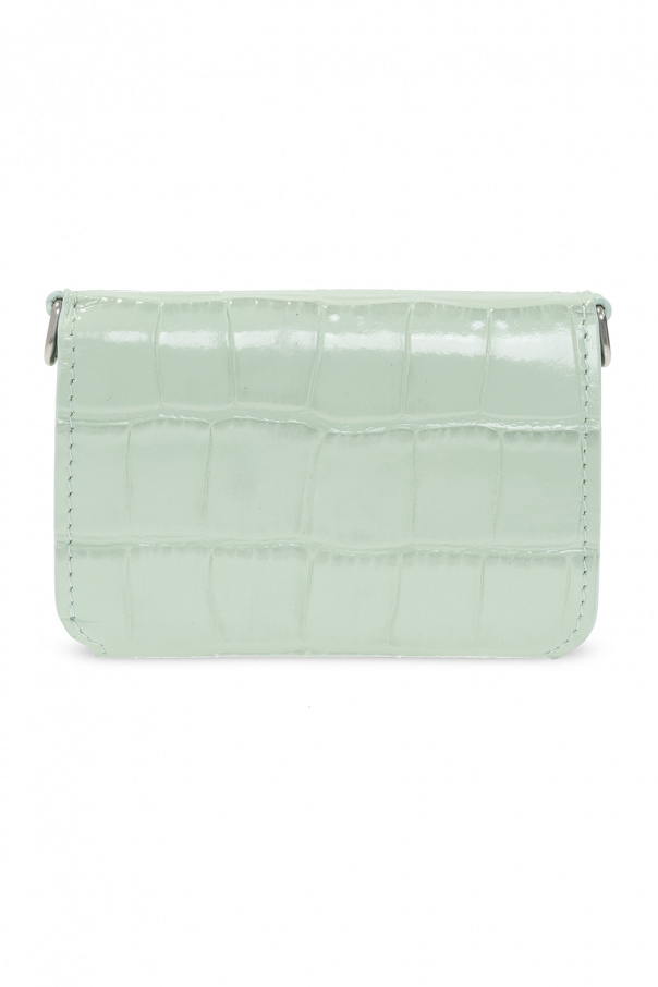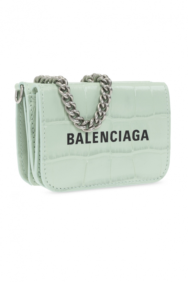 Light green card holder from Balenciaga. Made of croc-embossed leather, this item features a snap closure, snap-fastened coin pocket with a black logo print, chain strap, internal bill compartment and three card slots.