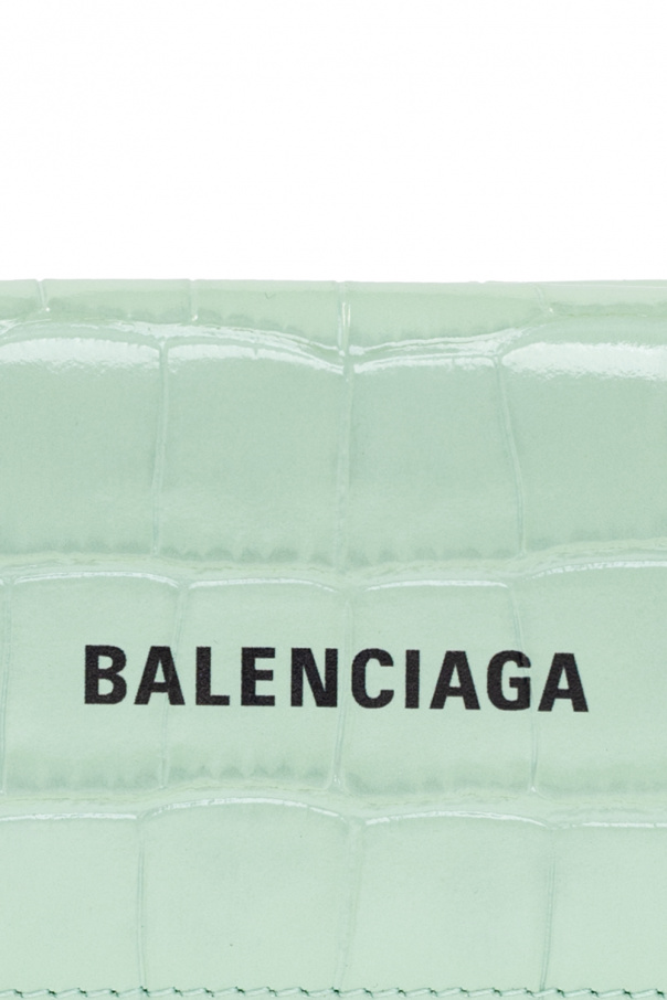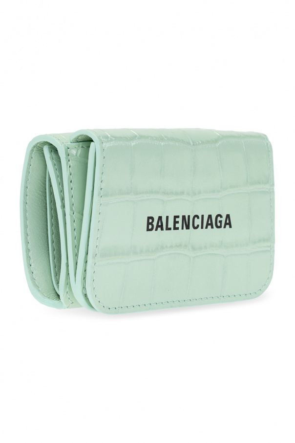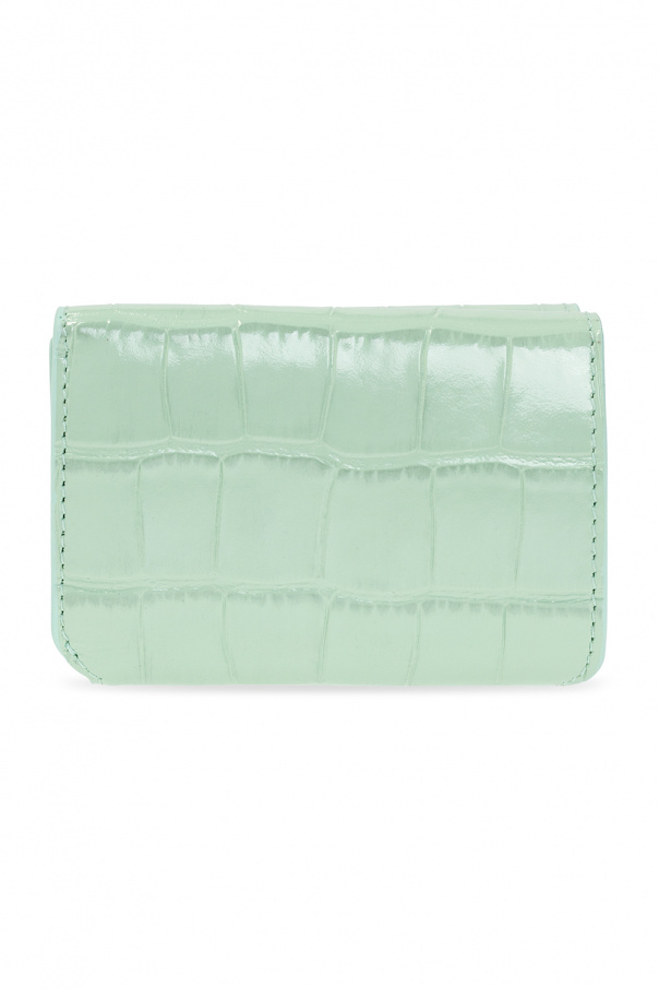 Light green folding wallet from Balenciaga. Made of croc-embossed leather, this model fastens with a snap and is decorated with a black logo print. It has a bill compartment, snap-fastened coin pocket and three card slots inside.