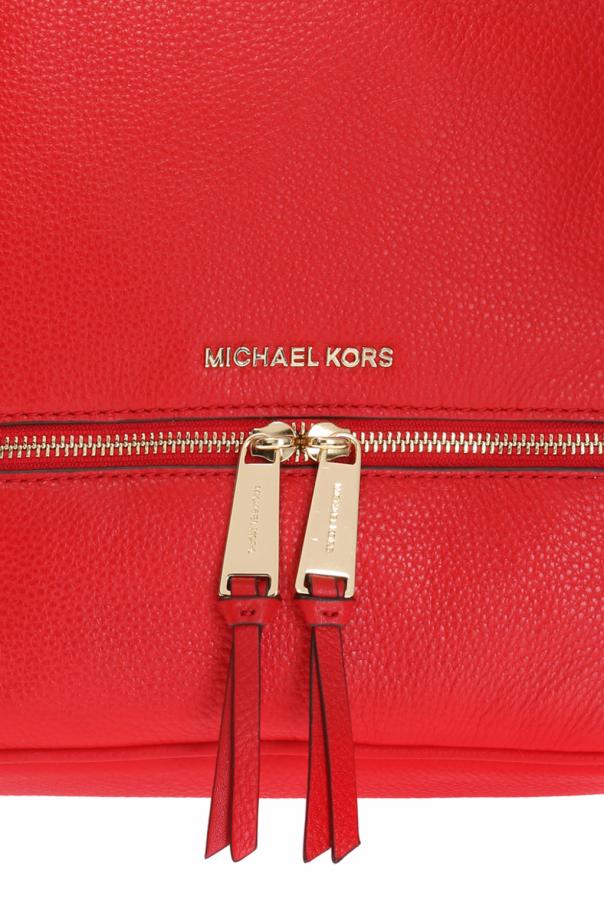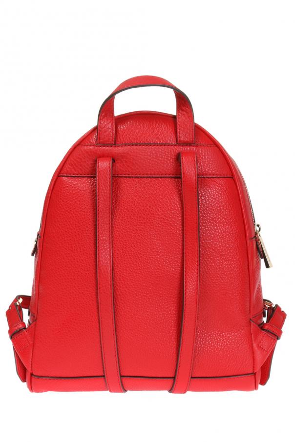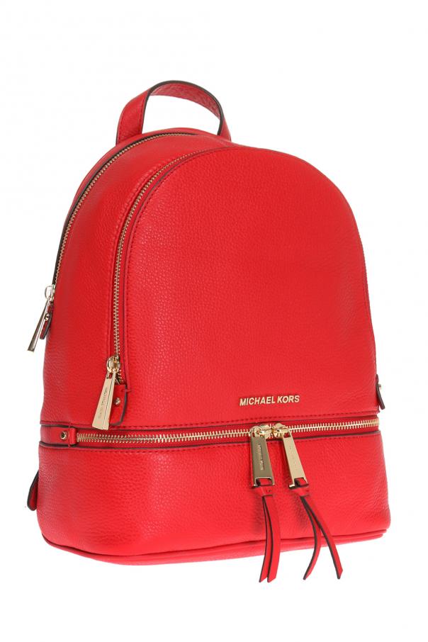 Red 'Rhea-Zip' backpack from Michael Michael Kors. Made of Saffiano leather. 2 separate zip compartments. Metal logo and two-way zip pocket at front. Semi-round handle. Adjustable shoulder straps. 1 zip pocket and 3 slip pockets inside. Gold-tone metal hardware.