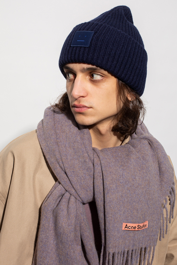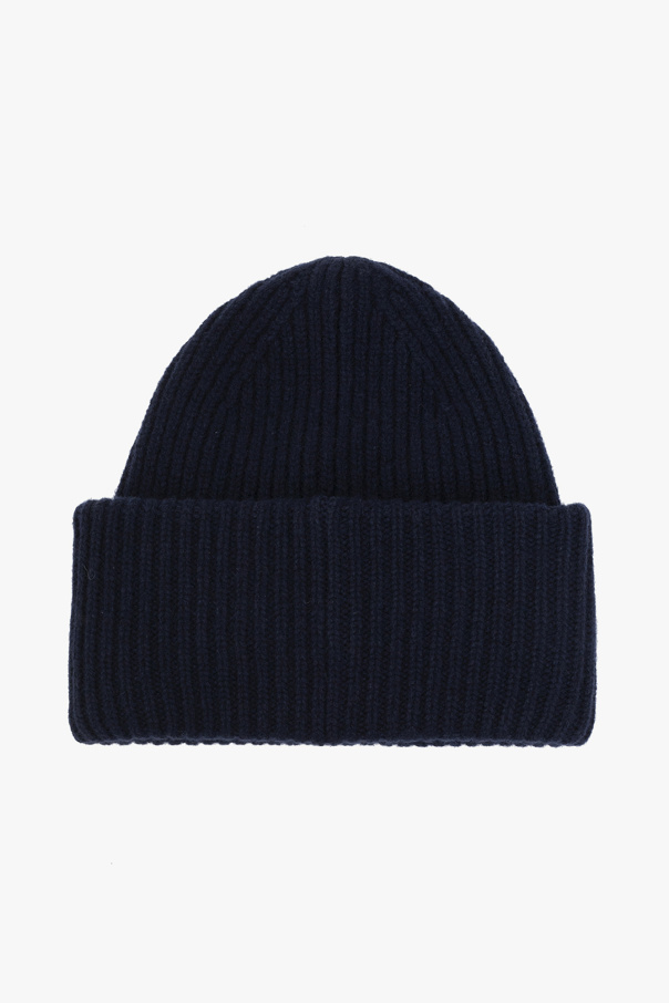Navy blue beanie from Acne Studios. Crafted from wool in a rib-knit design, this item showcases a logo patch for brand recognition.