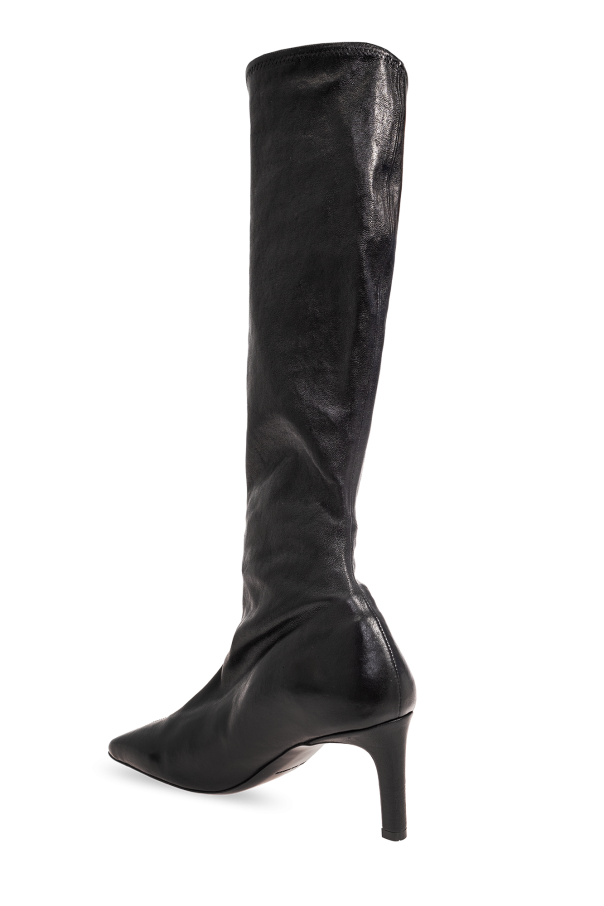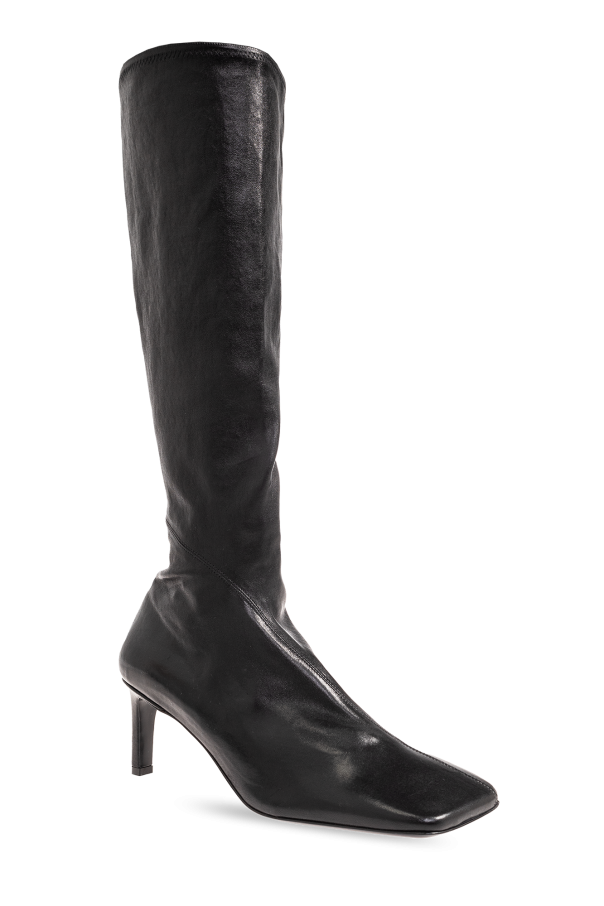 Black heeled sandals from JIL SANDER. Made of leather, this slip-on pair features adjustable straps with silver-tone buckles and a black leather sole.