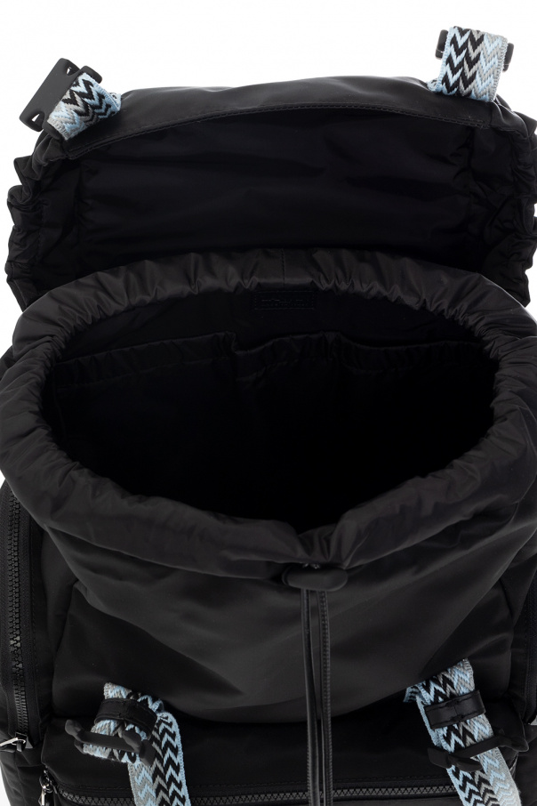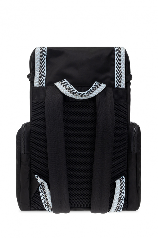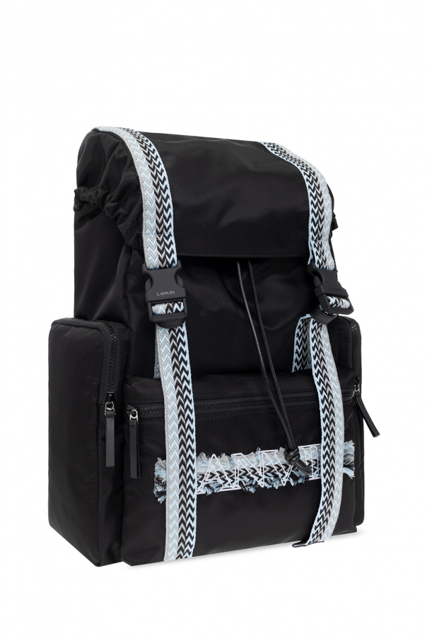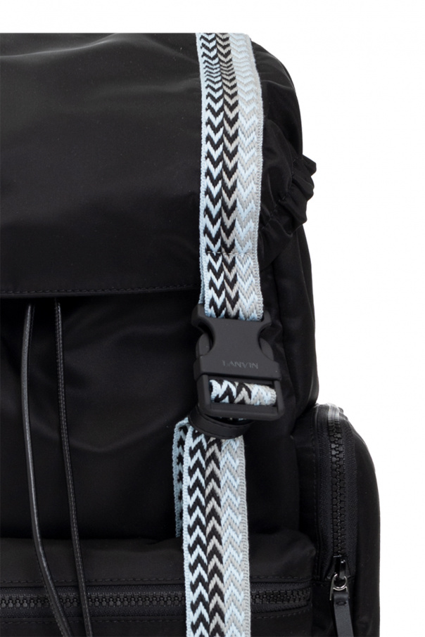 Black backpack from Lanvin. Fastened with drawstrings and snaps, this model features blue, grey and black trims, logo embroidery, three zip pockets, two zipped front pockets, one zipped back pocket, half-round handle, adjustable shoulder straps and one internal compartment with one slip pocket