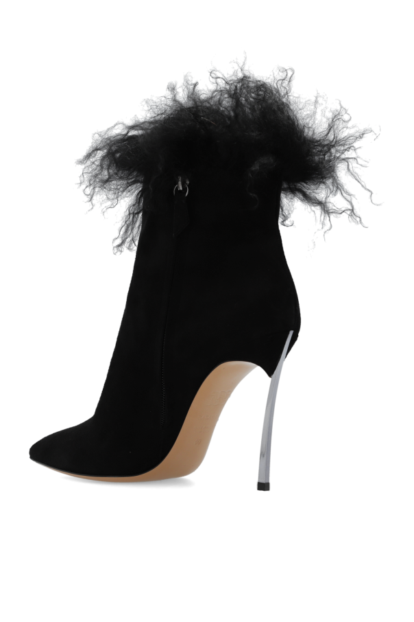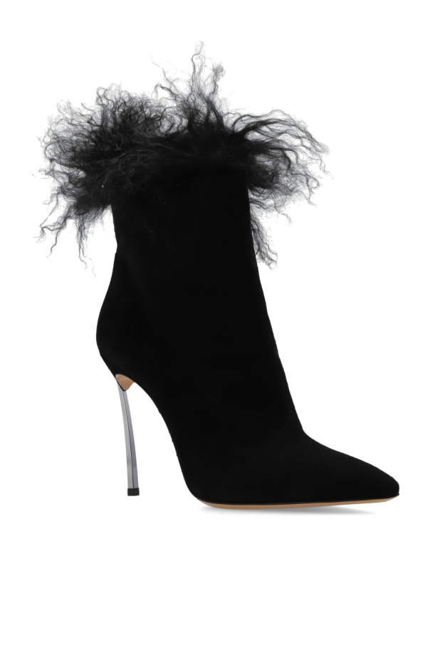 Black ‘Blade’ heeled ankle boots from Casadei. Made of suede with fur trims, this pair sits on a beige leather sole and features a side zip and pointed toe.