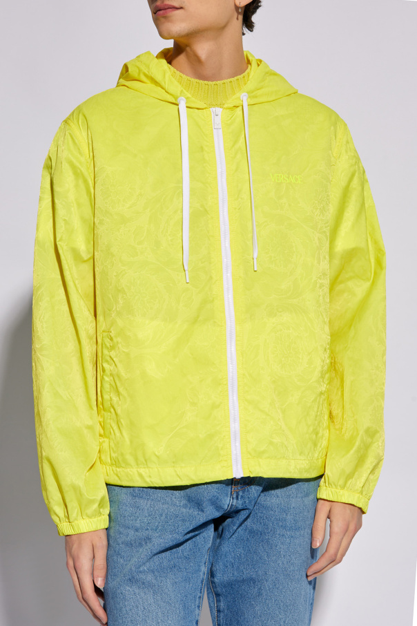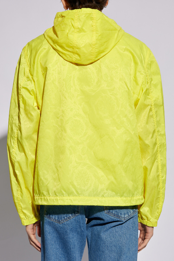 Yellow lightweight jacket from Versace. Enriched by a signature Barocco pattern, this style fastens via a zip and features a drawstring hood, two snap-fastened front pockets and long sleeves with elasticated cuffs.