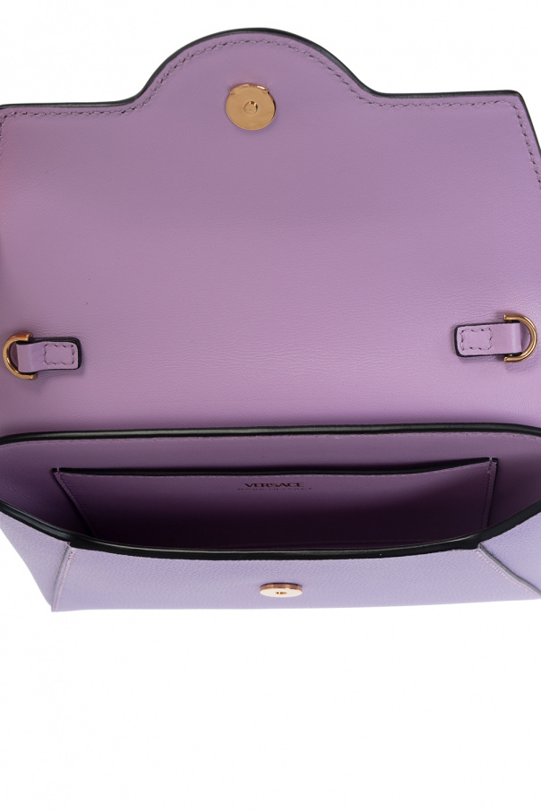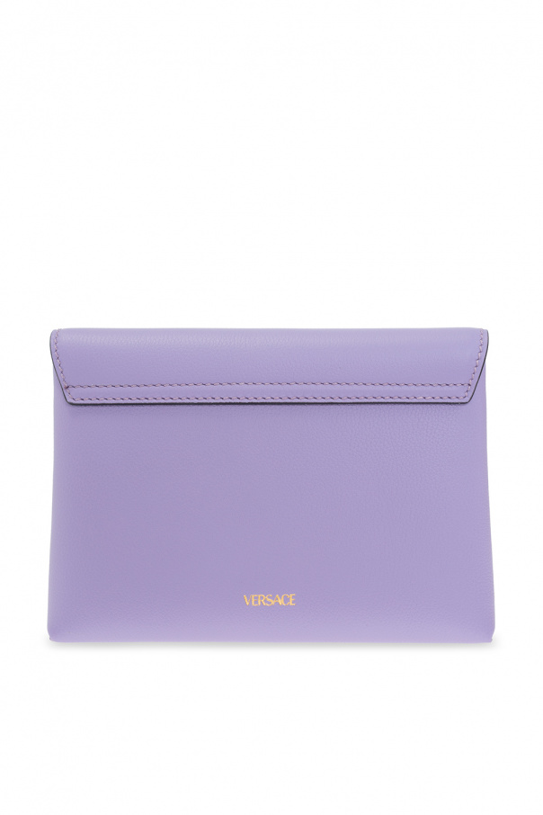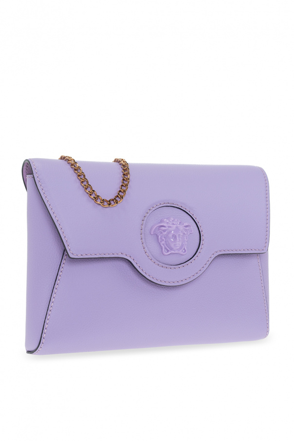 Purple ‘La Medusa’ clutch from Versace. Made of calf leather, this design secures with a magnetic fastener and features a signature Medusa application on the front, a detachable chain shoulder strap, gold-tone metal hardware and one internal compartment with a slip pocket.
