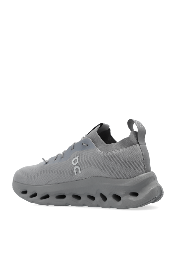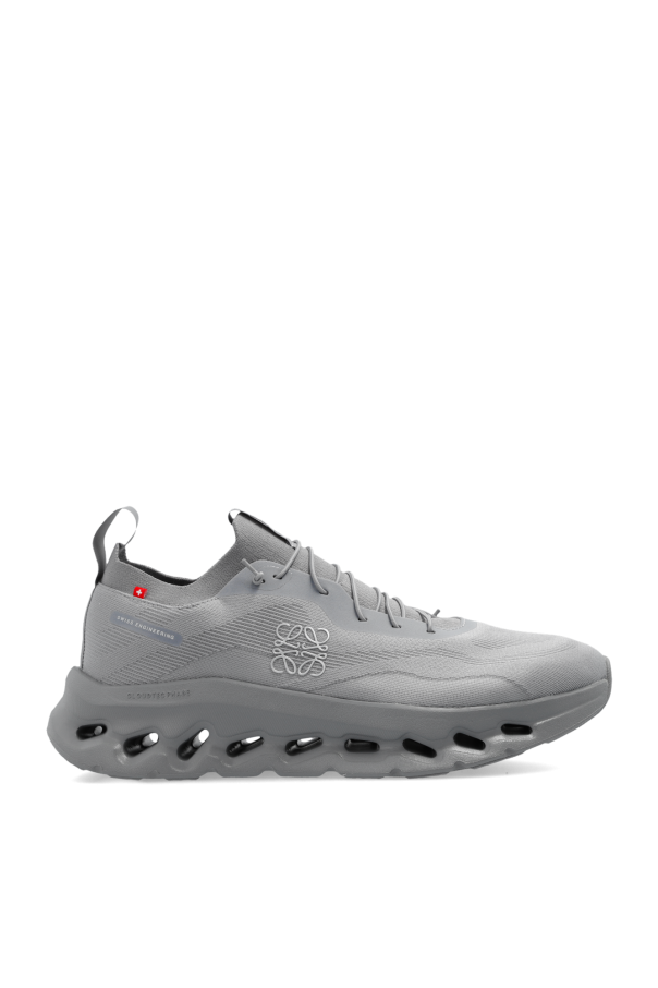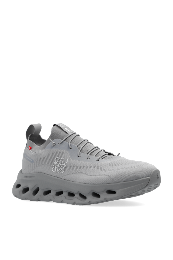 Grey ‘Cloudtilt’ sneakers from Loewe x ON. Made from waterproof material, this lace-up model sits on a grey rubber sole and showcases a silver-tone logo pattern. A limited-edition capsule collection that is dedicated to adventurous fans of great design. It represents a new approach to craft techniques. It was created with the urban outdoor lifestyle in mind.