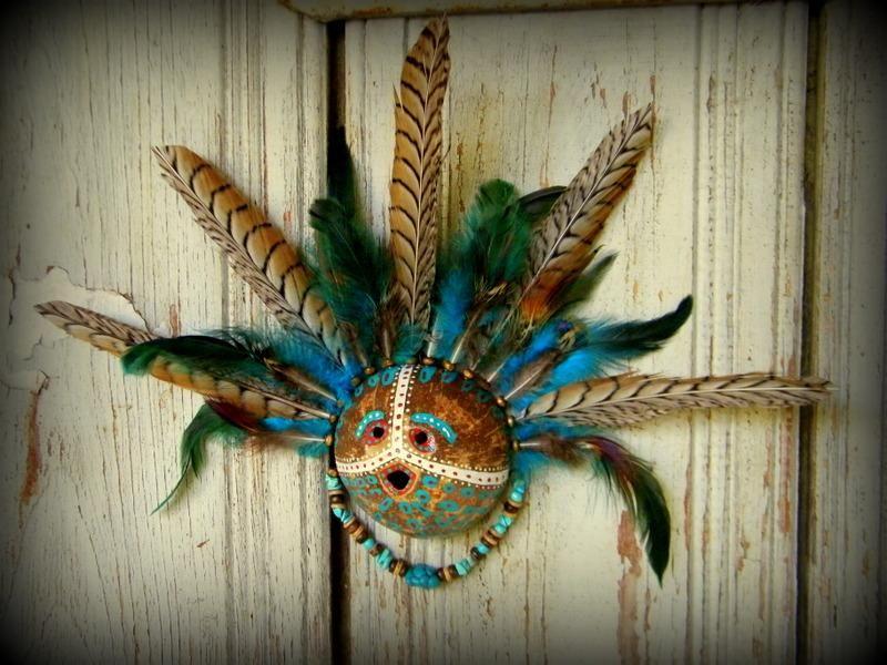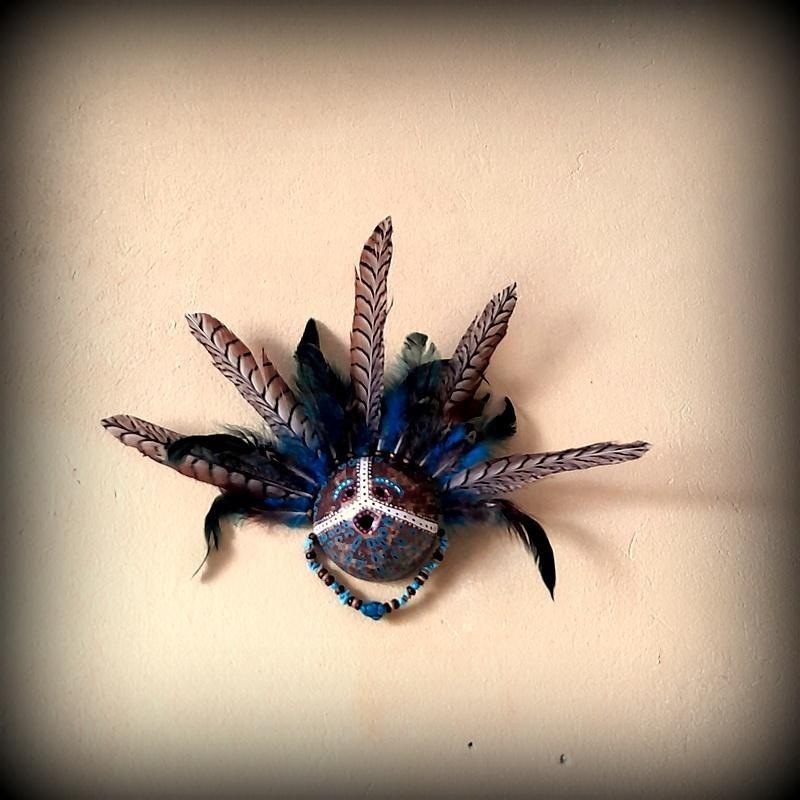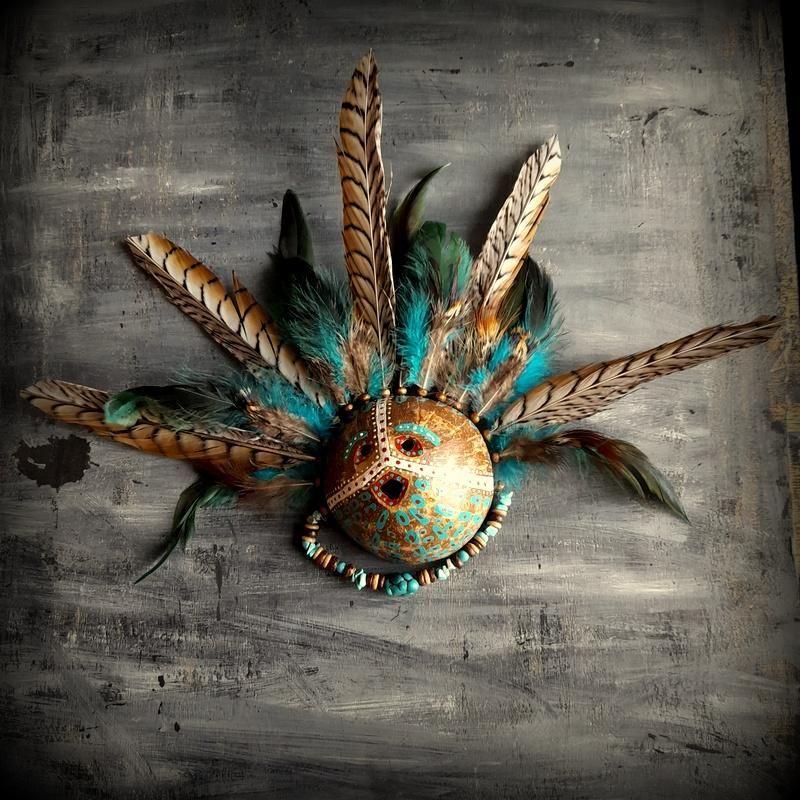 Маска изготовлена из носков кокоса, росписная акриловыми красками. Украшена перьям петуха, охотничьего и алмазного фазана. Ожерелье выполнено из деревянных и бамбуковых бусин и бирюзы (говлет).Такая оригинальная маска украсит вашу спальню, гостиную и даже детскую комнату. Отличный неповторимый подарок на день рождения, новоселье и любое другое событие.