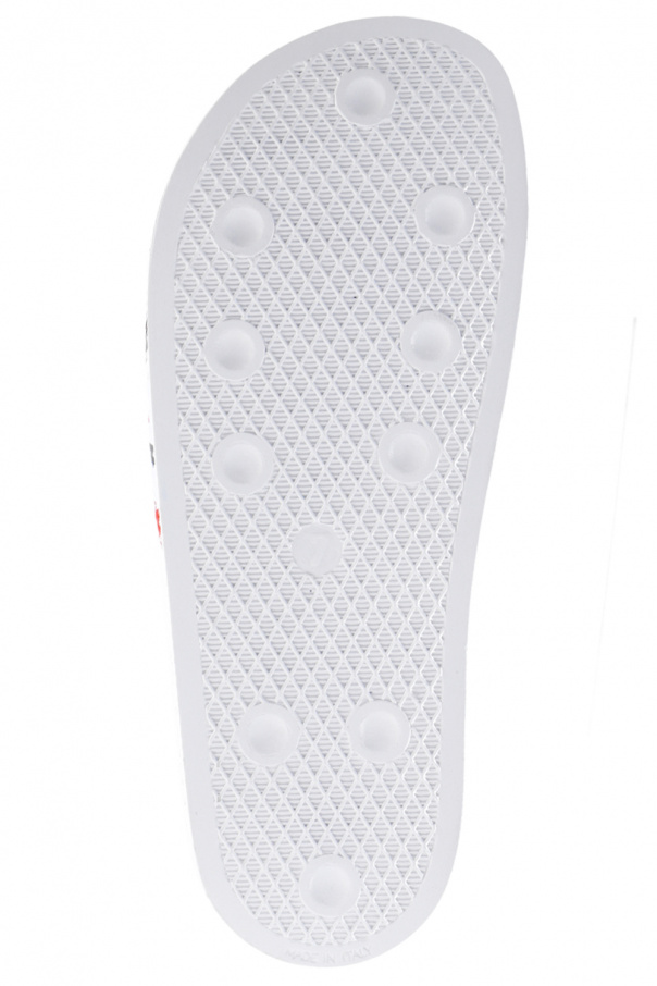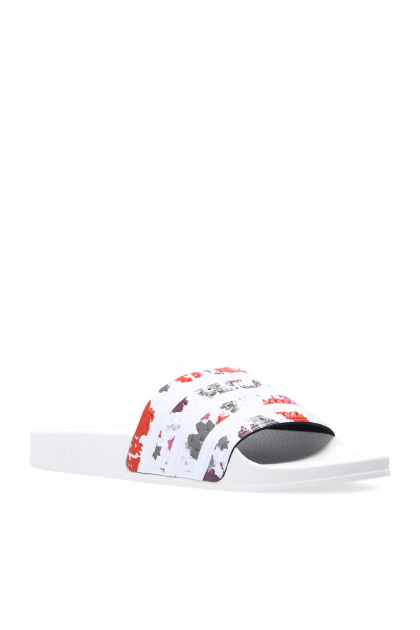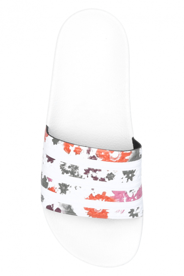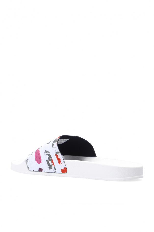 White ‘Adilette W’ slides from ADIDAS Originals. Boasting the iconic three stripes in white and a colourful graphic pattern, they sit on a white rubber sole.
