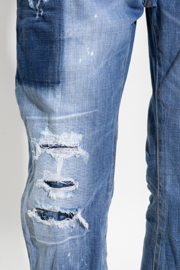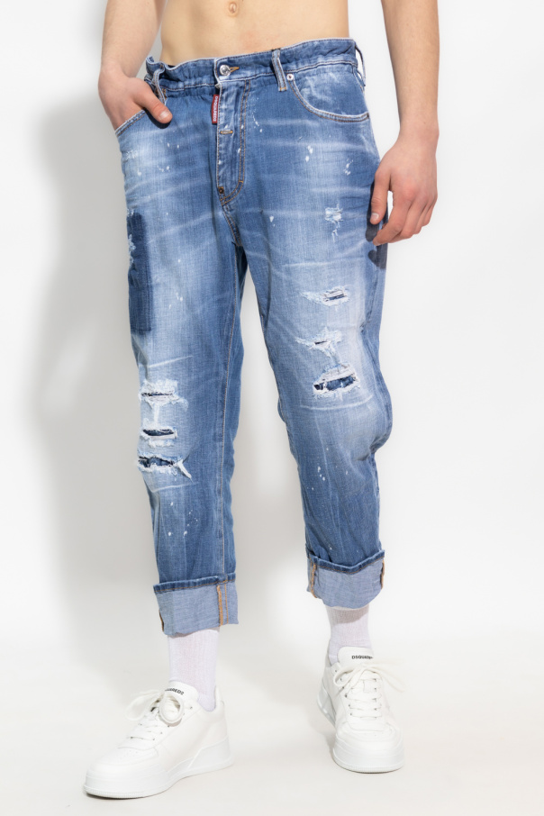 Blue ‘Big Brother’ jeans from Dsquared2. Crafted from cotton with a vintage effect, this pair falls with tapered legs and features button fastenings and decorative graphic prints.