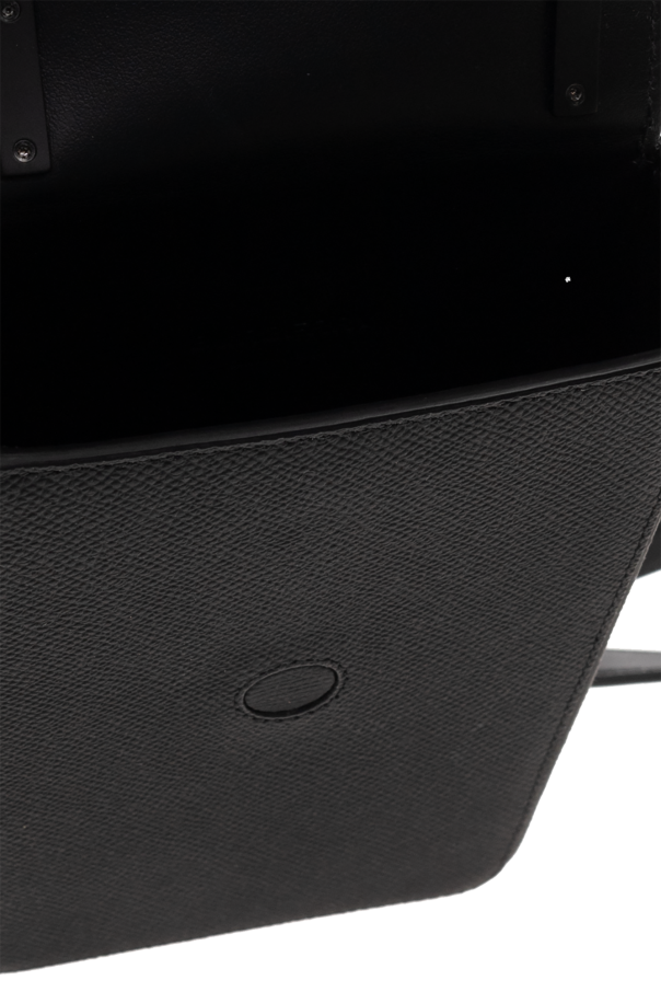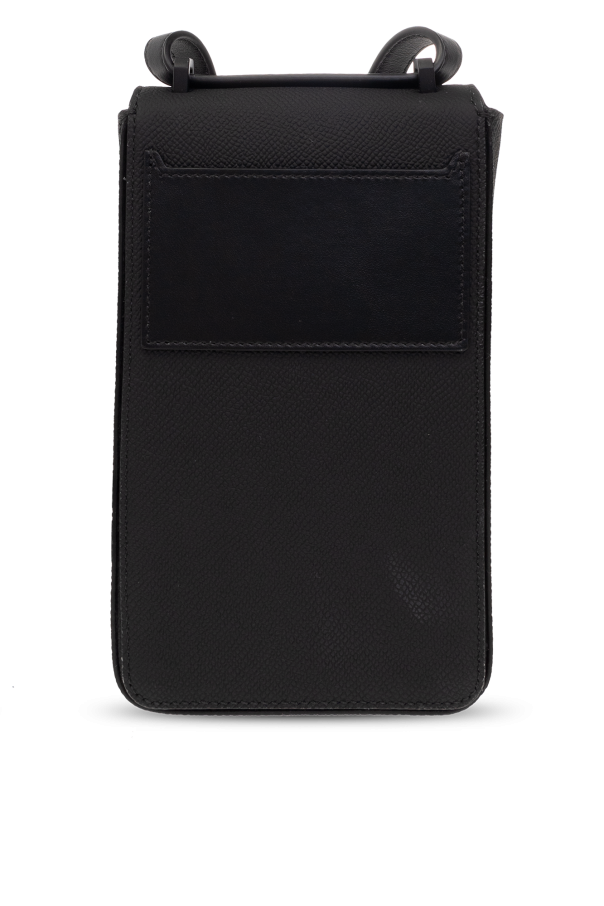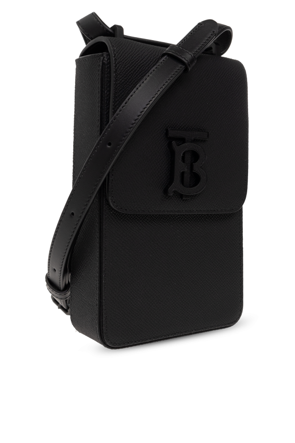 Black phone holder from Burberry. Crafted from grained calf leather, this item secures with a magnetic fastener and features a logo plaque on the front, one back card slots, adjustable shoulder strap and one internal compartment.