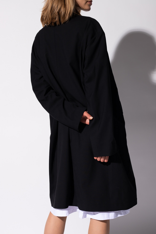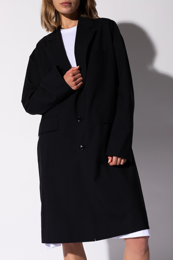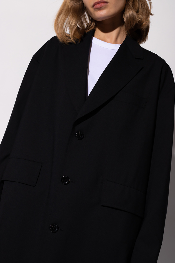 Black coat from Junya Watanabe Comme des Garçons. Made of a wool blend, this style fastens via buttons and features notch lapels and three pockets on the front – including two flapped ones.