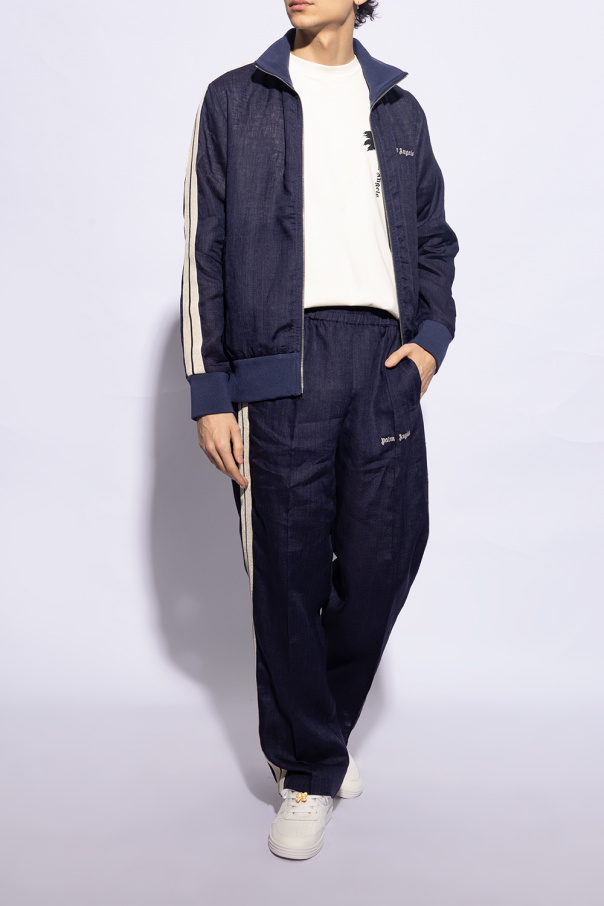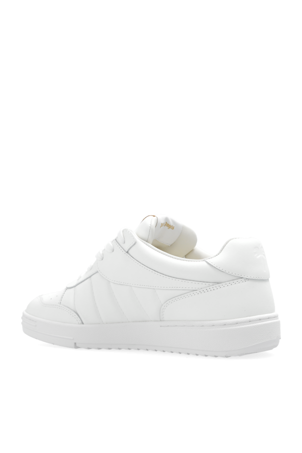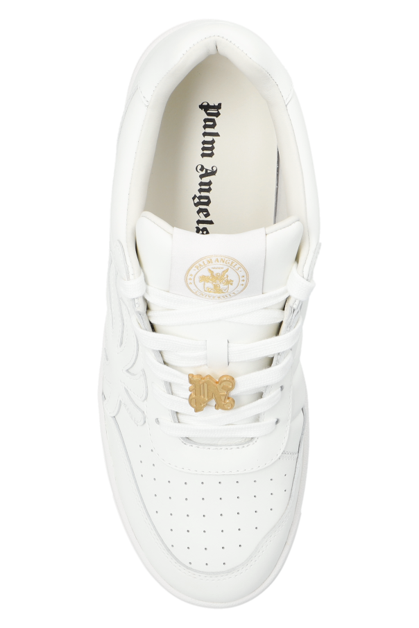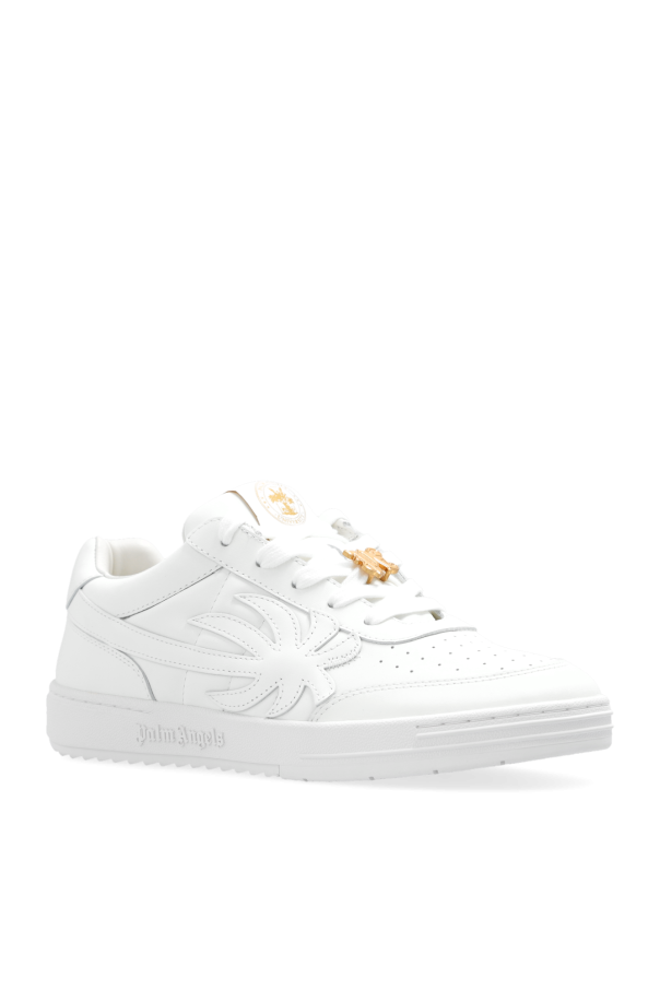 White ‘University’ sneakers from Palm Angels. Made of smooth leather, this lace-up pair features a logo patch, gold-tone logo detail, patch with the brand’s signature palm, perforations and a white rubber sole.