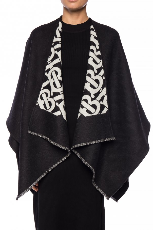 Black poncho from Burberry. Made of wool. It features fringe piping as well.