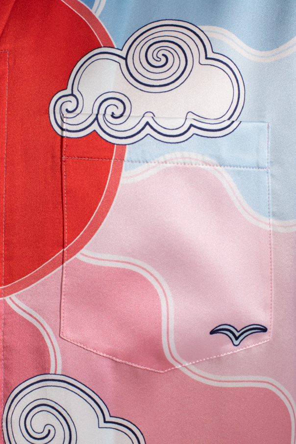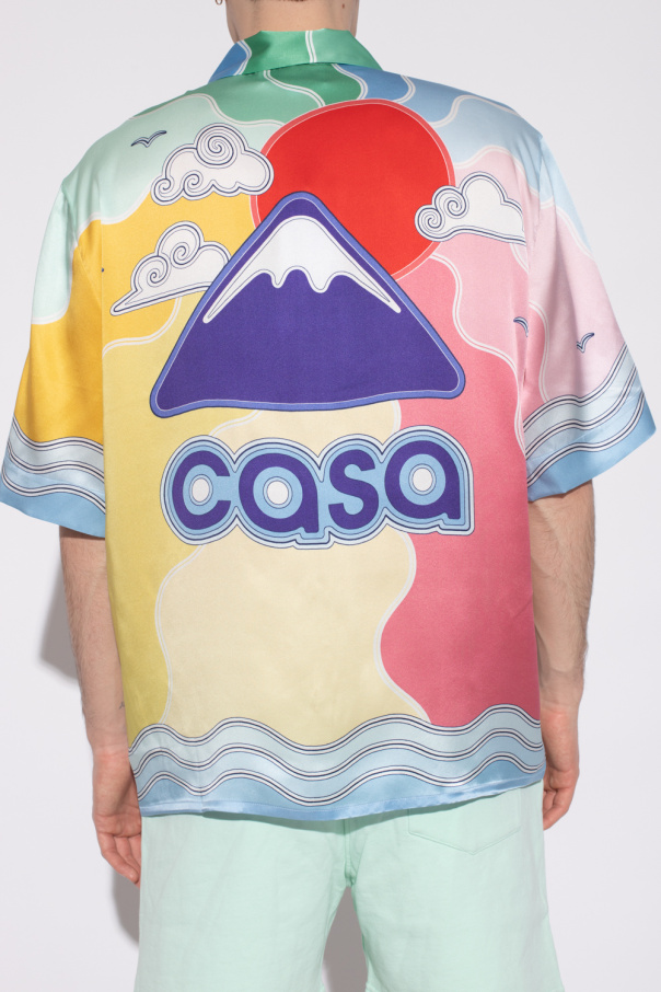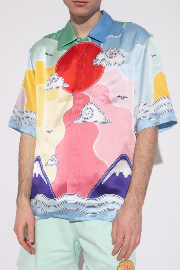 Multicolored shirt with shorts sleeves from Casablanca. Crafted from silk satin, this garment features buttons with a concealed placket, Soleil Levant pattern with the Mount Fuji motif, logo detail, Cuban collar and front pocket.