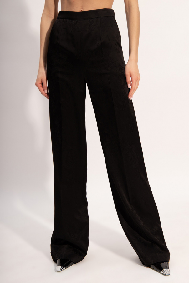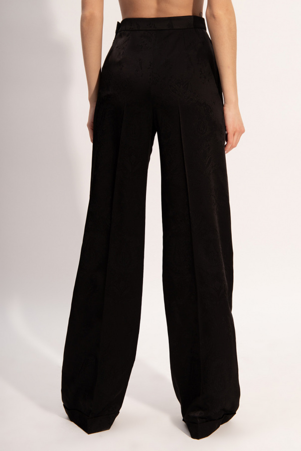 Black trousers from Saint Laurent. Enriched by an all-over jacquard motif, this high-waisted pair fastens via a zip and hook on the side and features two front slant pockets and wide, pleated legs with upturned cuffs.