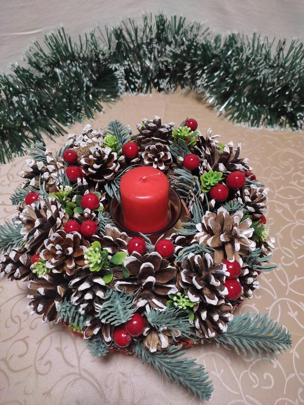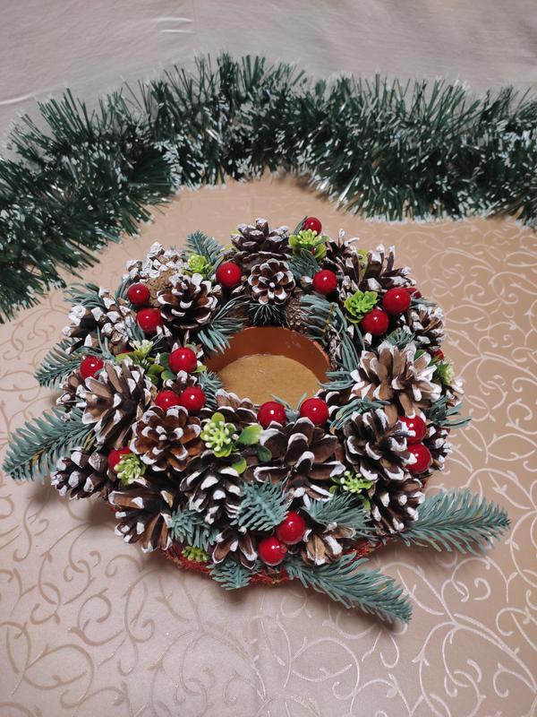 Подсвечник Новогодний из натуральных шишек и новогоднего декора, на ножках из деревянных бусинок. Диаметр - 23 см.
